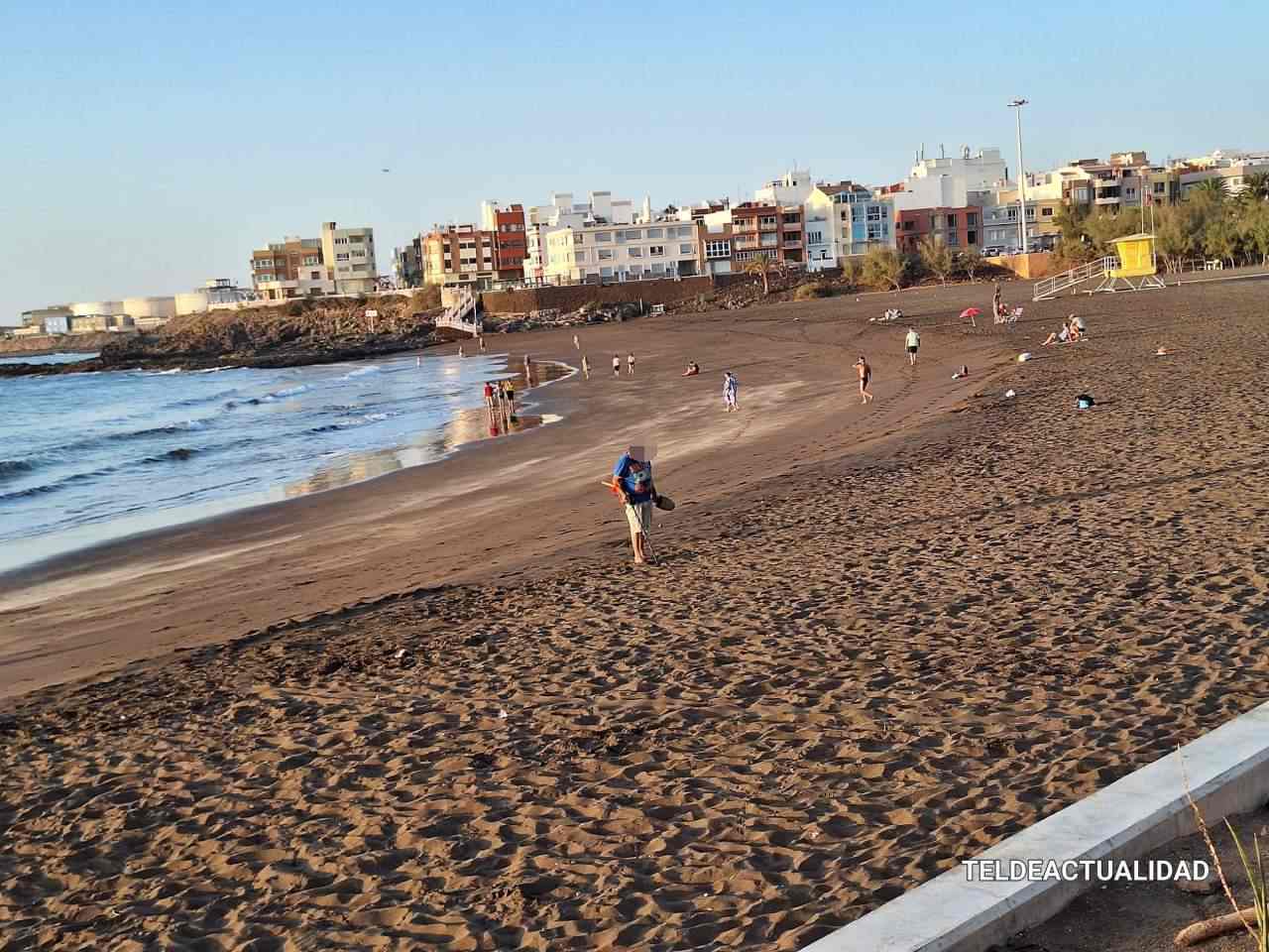 Habitualmente se puede ver en la playa de Melenara a un buscador de joyas y monedas que realiza esta acción gracias a un detector de metales, como en las imágenes captadas días atrás a primera hora de la mañana en esta cala teldense.