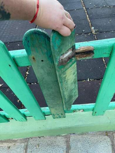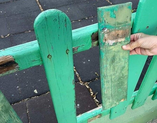 Explican que las barandillas que rodean el espacio de juego se caen ya que las maderas están podridas y se quedan los tornillos sobresaliendo.