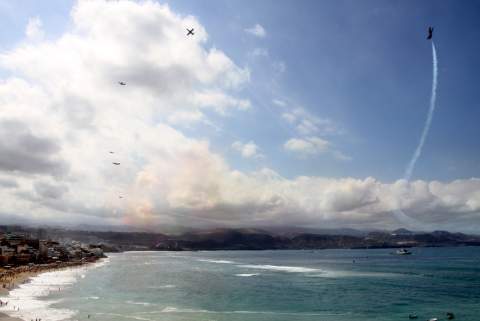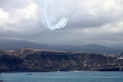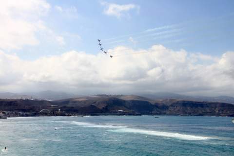 Rafael Marín, de Murcia, acudió siendo un niño a ver la exhibición aérea de la Patrulla Águila, y ese día decidió que su futuro sería ser piloto militar. Él y sus cinco compañeros llenaron el cielo de la playa de Las Canteras este domingo en una muestra de habilidad que regresa tras más de diez años a la ciudad. TA ofrece dos reportajes gráficos de los colaboradores Jesús Ruiz Mesa y Antonio Alí.