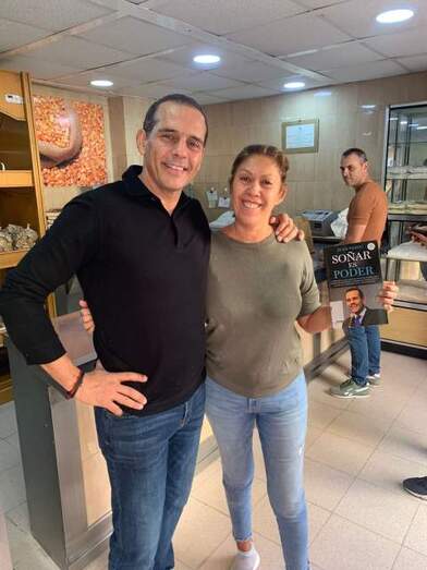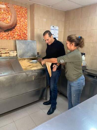 El empresario y asesor económico y político, el teldense Juan Verde, está de visita en el municipio y acudió el pasado sábado al Molino de Fuego para saludar a Elena Sánchez, socia copropietaria del negocio de la calle de María Encarnación Navarro.