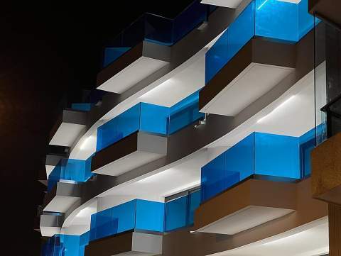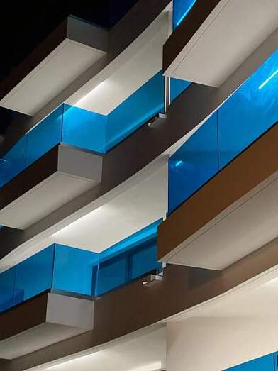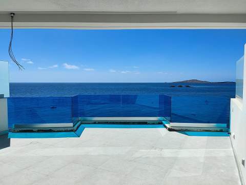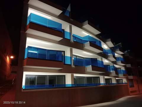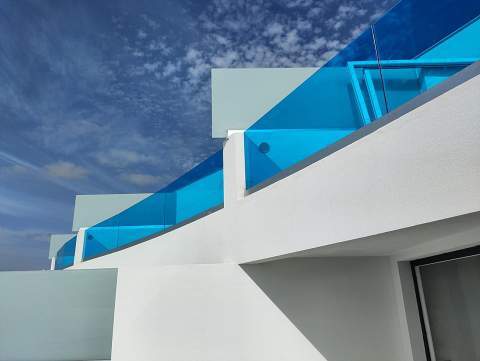 Cabe destacar la Carpintería exterior con perfiles de PVC, rotura de puente térmico y doble acristalamiento, proporcionando confort acústico-térmico y eficiencia energética. Barandillas de terraza de vidrio laminado de seguridad en tono azul que se integran con el entorno marino.