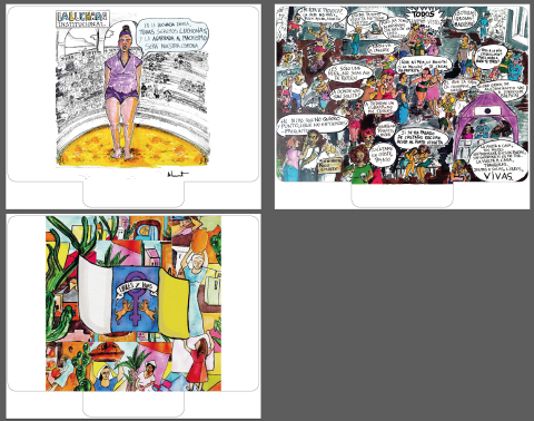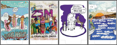 La exposición de Carolina Bonino Moreno ‘Somos más fuertes, porque somos libres’ está compuesta por 11 ilustraciones tituladas ‘Al Fondo del Mar’, ‘Fidelis praetor’, ‘Piropo’, ‘La fiesta es violeta’, ‘Nunca caminas sola’, ‘Parada solicitada’, ‘El futuro, nuestra conquista’, ‘La luchada institucional’, ‘Libres y vivas. Mosaico indigenista’, ‘Sí, aún hace falta el 8M’ y ‘Un océano de contradicciones’.