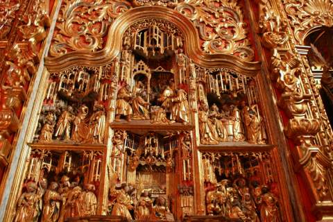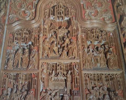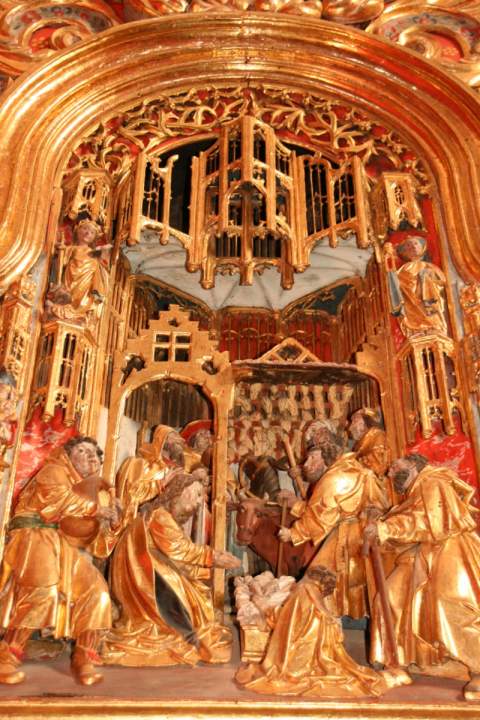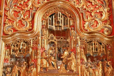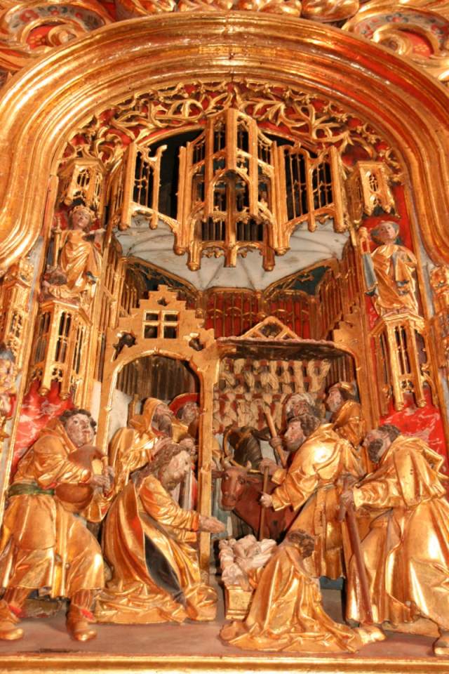 Las imágenes talladas se sitúan en planos simétricos y escalonados en profundidad con un sentido pictórico de la perspectiva. Presentan rostros ovalados, amplias frentes y unos mantos y ropajes de pliegues escultóricos típicos de los primitivos flamencos. A principios del siglo XVIII se colocó en el Altar Mayor, posteriormente y siguiendo una exigencia del Obispo Bernardo Vicuña y Suazo en 1697, se ordena levantar el retablo para dejar más espacio al Sagrario y realizar a ambos lados dos nichos para colocar las imágenes del Niño Jesús y de San Juan Bautista.