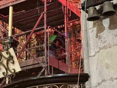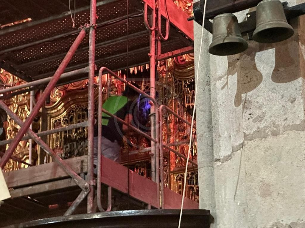 Desde hace unas semanas, el especialista en restauración de obras artísticas, el grancanario Iván Arencibia Rivero, lleva a cabo labores de conservación y mantenimiento en el retablo gótico-flamenco del altar mayor de la Basílica de San Juan Bautista de Telde.