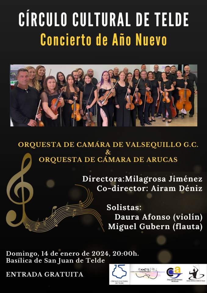 El Círculo Cultural de Telde celebra el domingo 14 de enero su tradicional Concierto de Año Nuevo. La Basílica de San Juan Bautista acogerá este recital en el que participarán, a partir de las 20.00 horas, las orquestas de cámara de Valsequillo y Arucas bajo la dirección de Milagrosa Jiménez y Airam Déniz, con Daura Afonso (violín) y Miguel Gubern (flauta) como solistas.