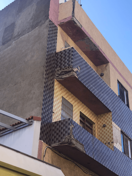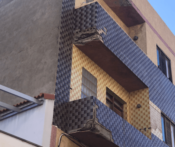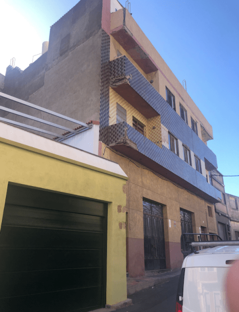 Vecinos de Los Llanos de Telde muestran preocupación por el estado de deterioro de la fachada de un edificio en la calle Fernando Estévez.