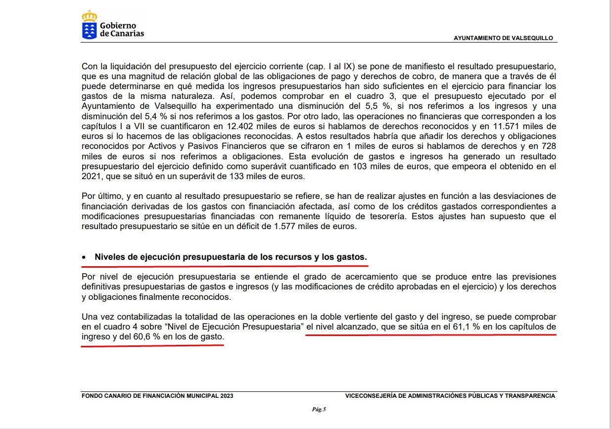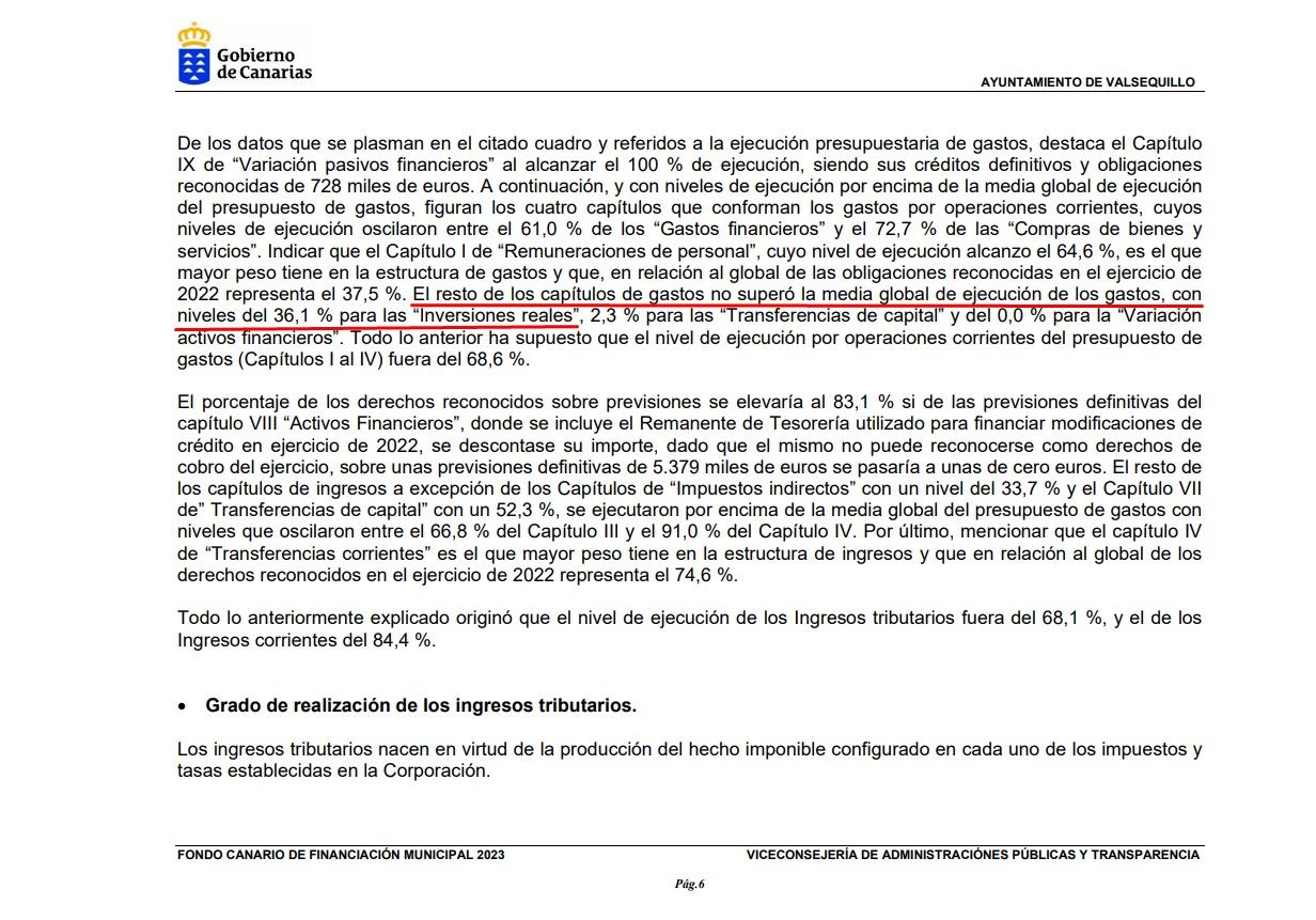 Asamblea Valsequillera (AV) denuncia que el Ayuntamiento de Valsequillo dejó sin ejecutar en 2022 el 64% del presupuesto para inversiones. La auditoría de gestión del Gobierno de Canarias revela que de los 4,5 millones para inversiones en el municipio sólo se emplearon 1,6.