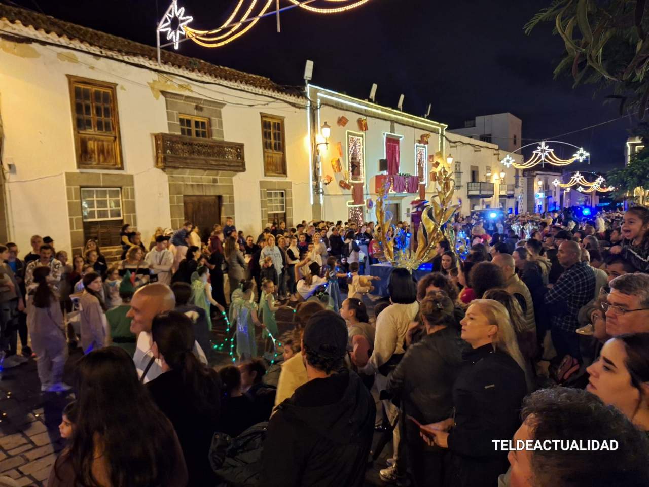 Este año, el recorrido se ha extendido aún más, llevando la alegría de la celebración a diversos rincones de Telde. La Cabalgata culminó en la emblemática plaza de San Juan, donde los Reyes Magos se dirigieron al balcón institucional del antiguo edificio del Ayuntamiento, un lugar decorado exquisitamente para la ocasión con regalos relucientes, telas exquisitas y luces, creando así un escenario perfecto para el clímax de la noche.