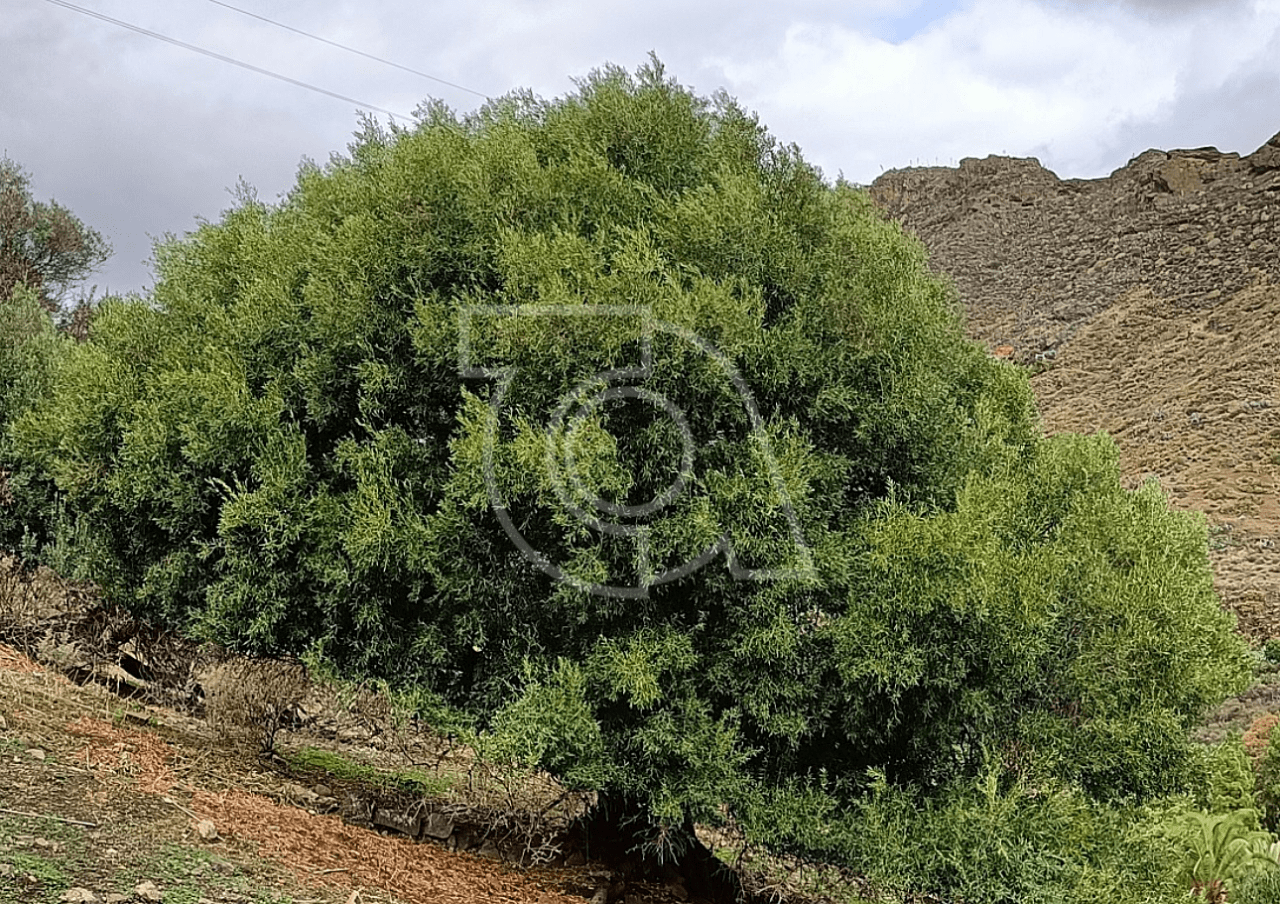 Es interesante observarla porque una decena de pinos foráneos cubren su ladera de umbría mientras en la de solana prosperan con buen desarrollo varios ejemplares de eucaliptos. Camino del centro son las palmeras canarias y los dragos quienes acompañan a los escolares hasta el colegio y una vegetación arbustiva donde a los veroles, esparragueras, bejeques, matos de risco, inciensos y algún que otro guaydil, todas ellas plantas autóctonas, se le unen diversas especies introducidas, fruto sin duda de esporádicas repoblaciones municipales y de los vecinos, con la intención de aportar color y variedad a la carretera de acceso. Así observamos buganvillas, madreselvas, pitas, tuneras, turbitos, plumíferos, aloes, zarzaparrillas, hibiscos… Situado en un lugar privilegiado llama la atención la bucólica imagen que se observa del acebuchal descendiendo por la ladera del barranquillo de Juan Inglés hasta confundirse con el palmeral que ocupa el cauce del citado barranquillo.