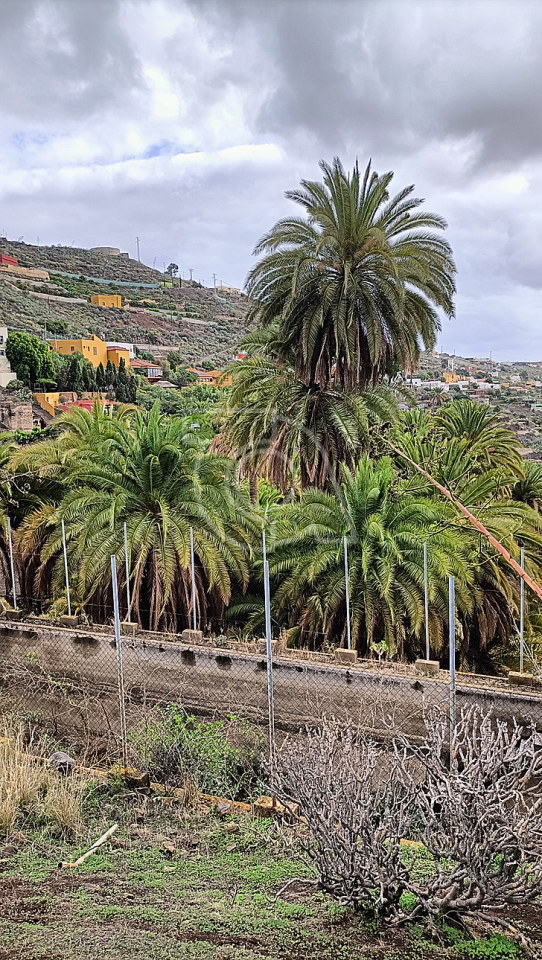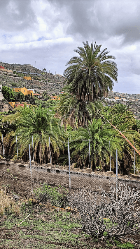 Esta ladera de umbría apenas presenta un par de casas aisladas. Sí observo algunas berreras al pie, así como la carretera que discurre por el fondo del barranco. También en este fondo de barranco se concentran un buen número de palmeras canarias siendo fácil contabilizar un amplio centenar de ejemplares.