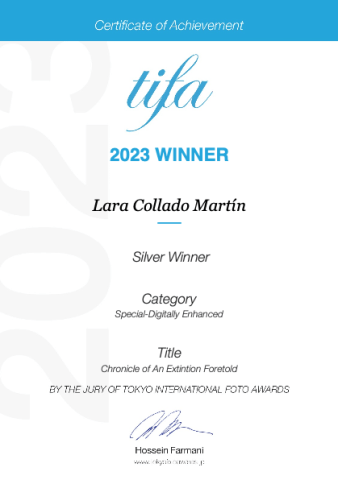 Los TIFA (Tokyo International Foto Awards) reconocen el talento de fotógrafos destacados de todo el mundo y los conecta con la comunidad creativa de Tokio, Japón. Este certamen es la culminación de un viaje dedicado a la excelencia fotográfica de Collado. Además, los TIFA no sólo premian su talento sino que también ofrecen a la joven artista una plataforma excepcional para presentar su obra a un público nuevo y conectar con la vibrante comunidad creativa de Tokio.