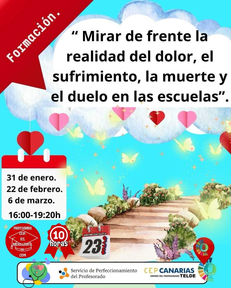 El Centro de Profesorado (CEP) de Telde organiza el curso ‘Mirar de frente la realidad del dolor: el sufrimiento, la muerte y el duelo en las escuelas', dirigido a personal docente de centros públicos de Bachillerato, Educación Infantil, Educación Primaria, Educación Secundaria Obligatoria, Formación Profesional y CEPA.