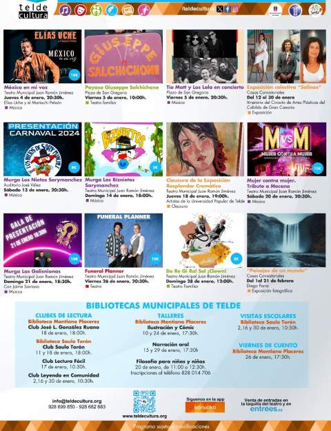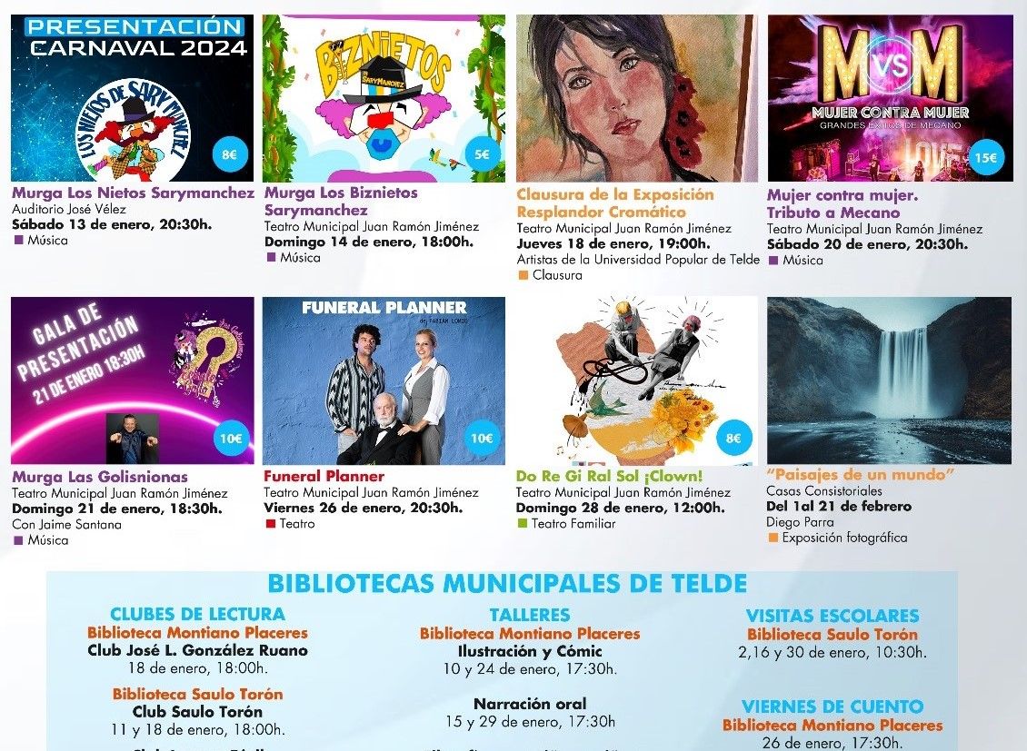 Las presentaciones de las murgas teldenses, exposiciones y obras de teatro copan la oferta cultural organizada por la Concejalía de Cultura de Telde para este mes de enero, a las que se suman múltiples actividades de las bibliotecas municipales para toda la familia.