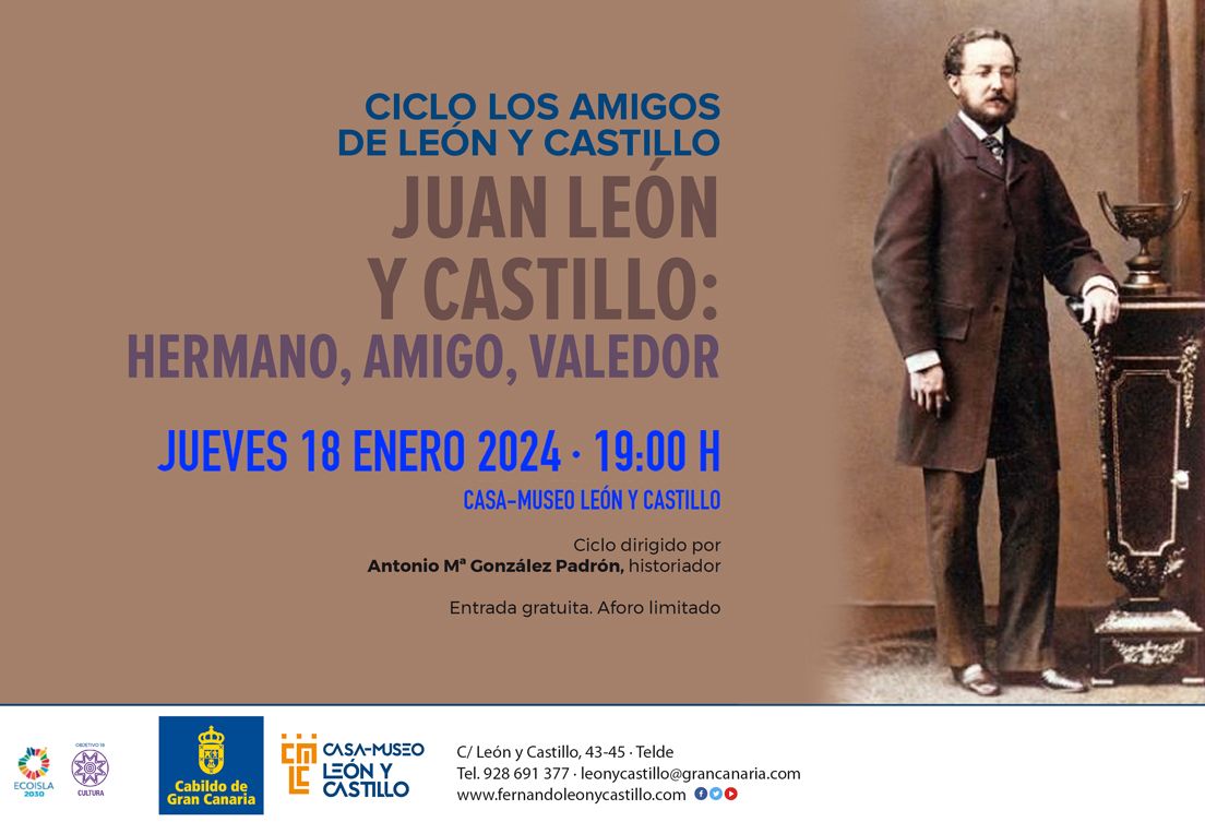 El historiador y cronista de Telde, Antonio María González Padrón, dirige el ciclo Los amigos/as de Fernando León y Castillo, dedicado a aquellas personalidades que jugaron un papel decisivo en la vida del político y diplomático grancanario en la esfera cultural, política y social de una época caracterizada por la restauración de la Monarquía de los Borbones en España. Y en esta ocasión, se centrará en su hermano a través de la conferencia Juan León y Castillo: hermano, amigo, valedor.