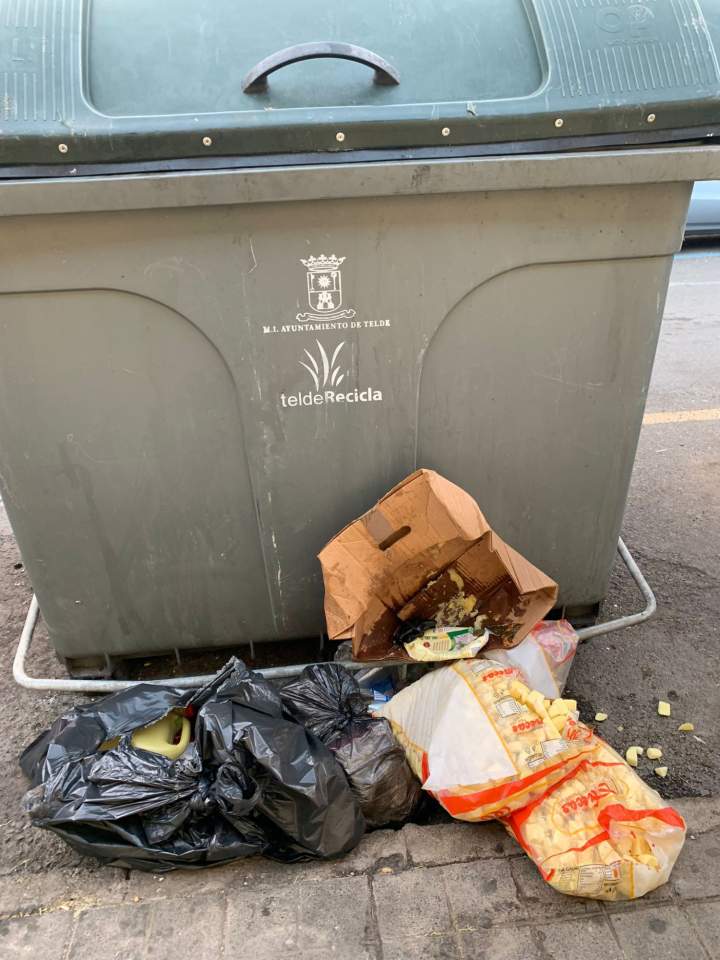 La calle de Doctor Gutiérrez Armario, en el corazón de la zona comercial de Telde, se ve afectado por un inquietante problema, ya que, según los vecinos, es frecuente observar comida y cajas esparcidas fuera de los contenedores de basura.