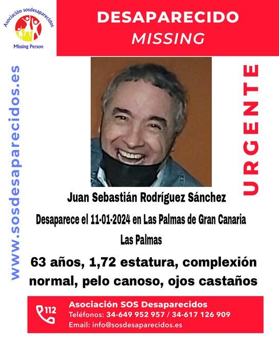 Las autoridades han iniciado la búsqueda de Juan Sebastián Rodríguez Sánchez, de 63 años, desaparecido desde el 11 de enero en Las Palmas de Gran Canaria.