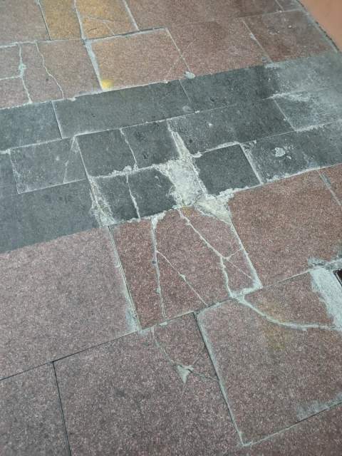 Vecinos de la calle Barbería, que días atrás denunciaron el mal arreglo que hizo el Ayuntamiento en el pavimento de esta calle peatonal, aseguran que los coches han vuelto a romper las losetas.