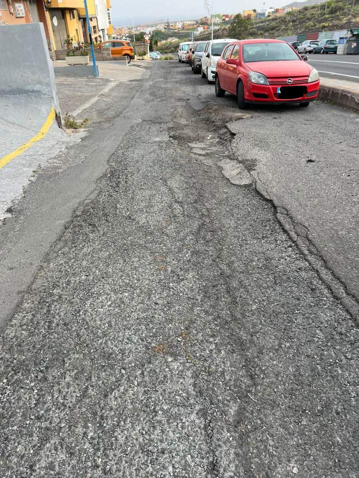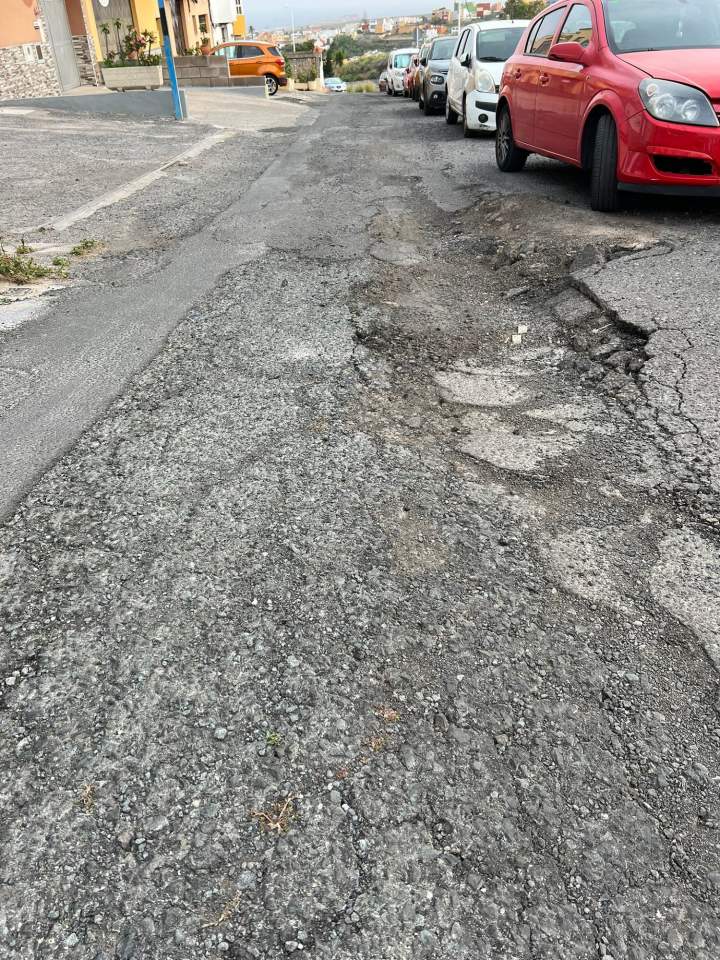 Vecinos de la calle Alfonso XIII, paralela a la GC-41, en el barrio de La Herradura, se quejan del mal estado que presenta el asfaltado en un tramo de esta vía, con grandes socavones que dificultan transitar con los vehículos y aparcar.