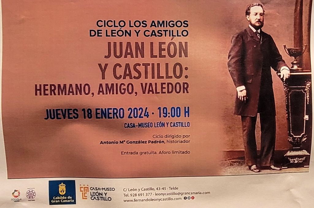 En la Casa Museo León y Castillo de Telde, la tarde del jueves 18 de enero se inicia el ciclo Los Amigos de León y Castillo con la conferencia, Juan León y Castillo: Hermano, Amigo, Valedor, que imparte el historiador, cronista de Telde, Antonio María González Padrón, Académico Correspondiente de la Real de la Historia (Madrid), en un recorrido biográfico en el contexto histórico de dichos personajes, don Juan León y Castillo y su hermano Fernando León y Castillo, claves para el impulso, desarrollo, progreso social, económico y político, tanto de Canarias como de la España del siglo XIX y del XX.