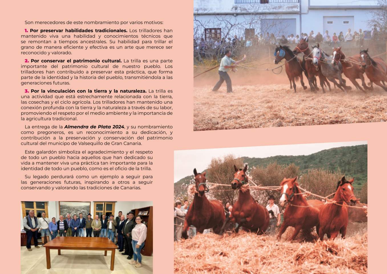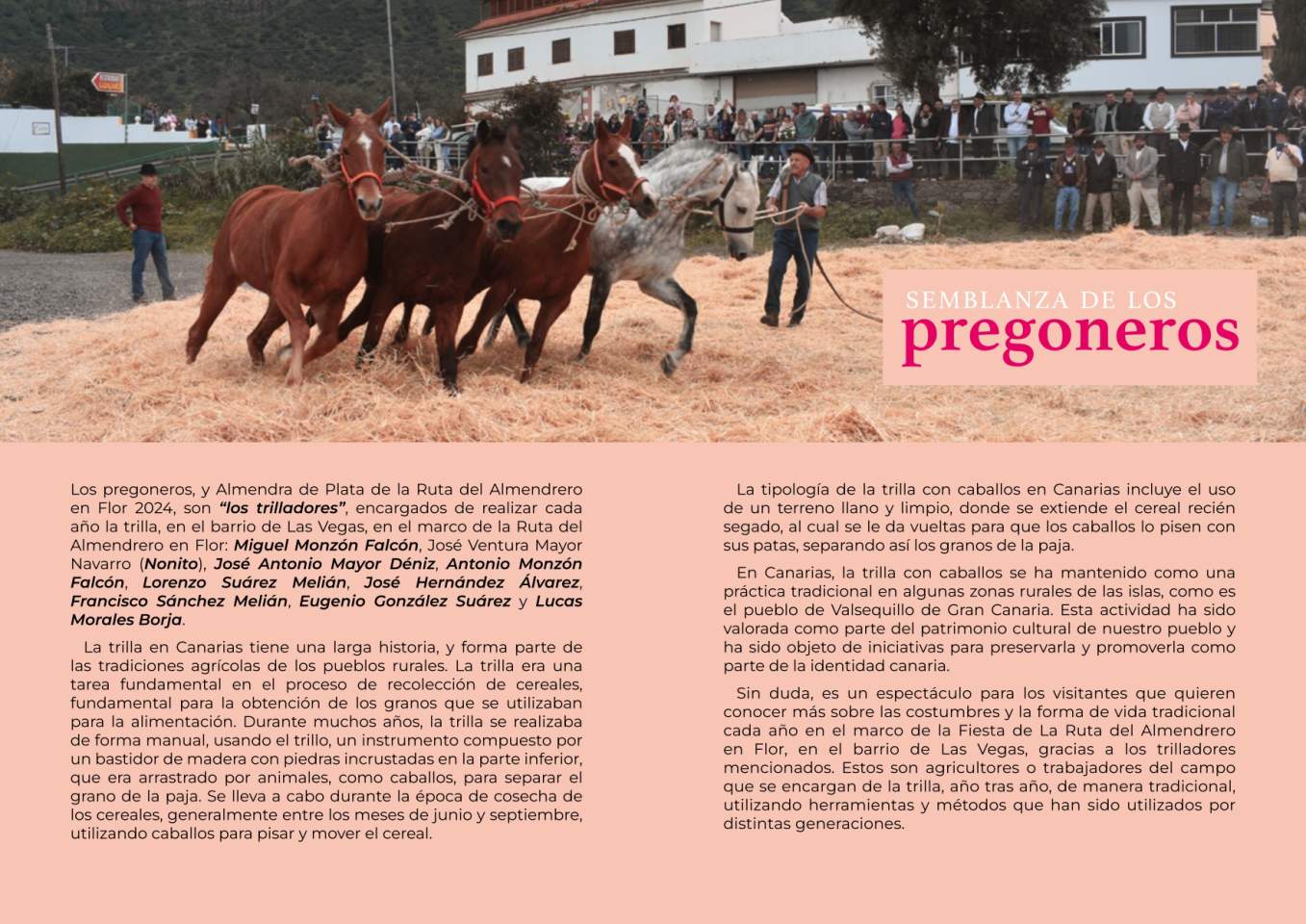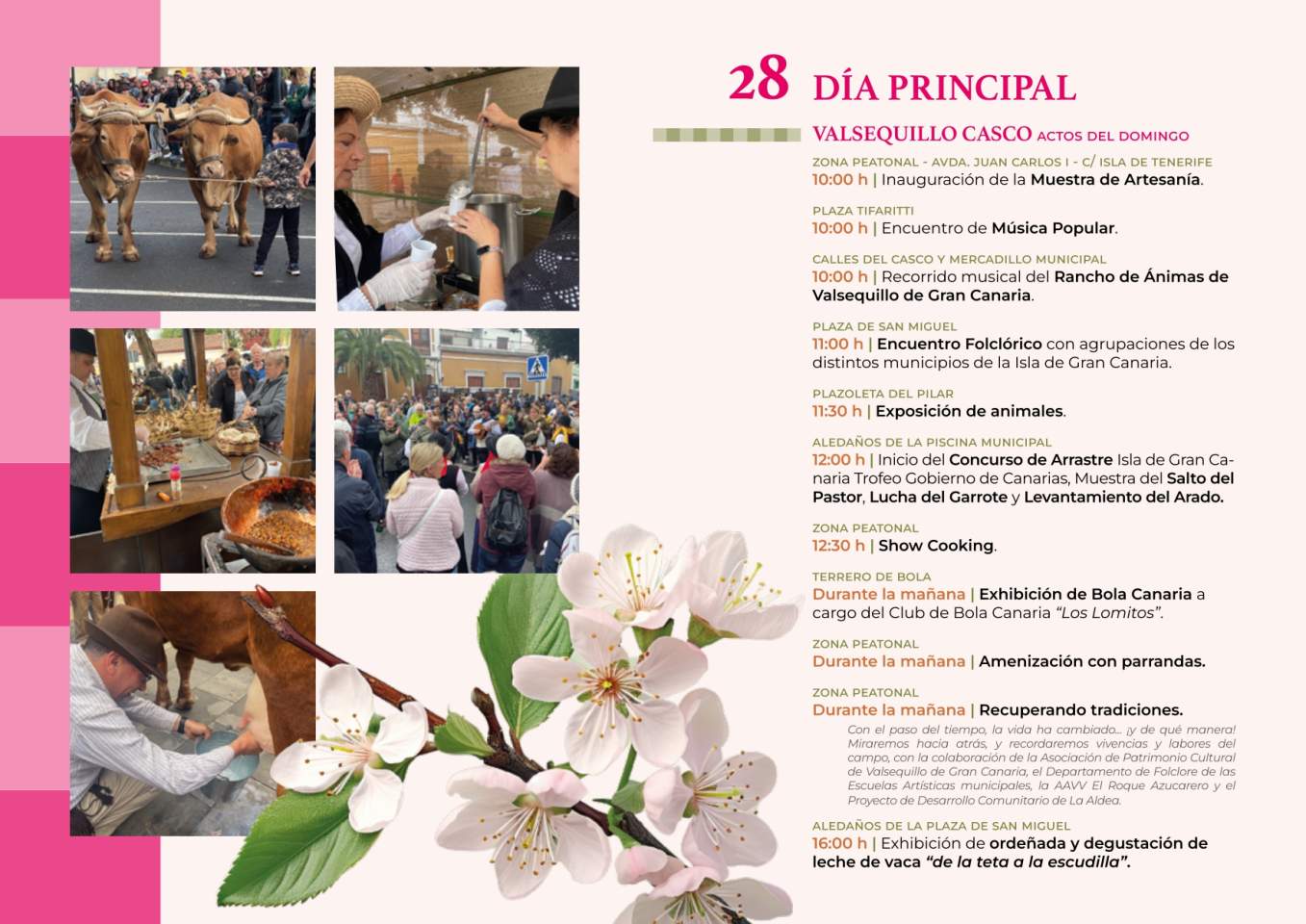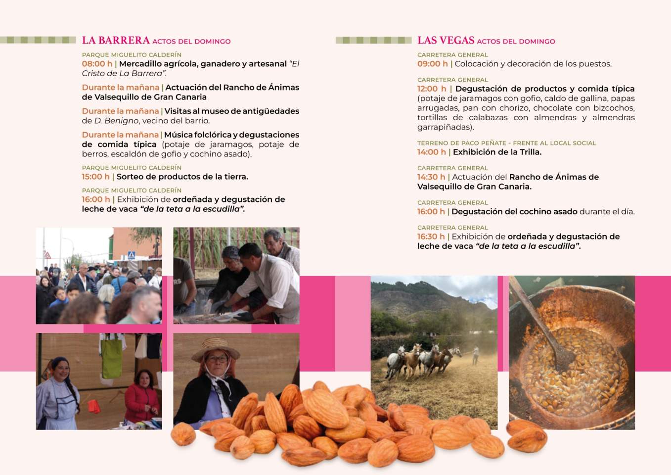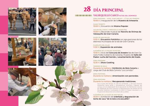 El domingo, día principal de la fiesta, Valsequillo mostrará lo mejor de la cultura canaria con una muestra de artesanía y una exposición de ganado. Además, un año más, en el barrio de Las Vegas se realizará la exhibición de la Trilla, mientras que, en el barrio de La Barrera se podrán visitar el museo de antigüedades y el mercadillo agrícola, todo acompañado de folclore y gastronomía canaria.
