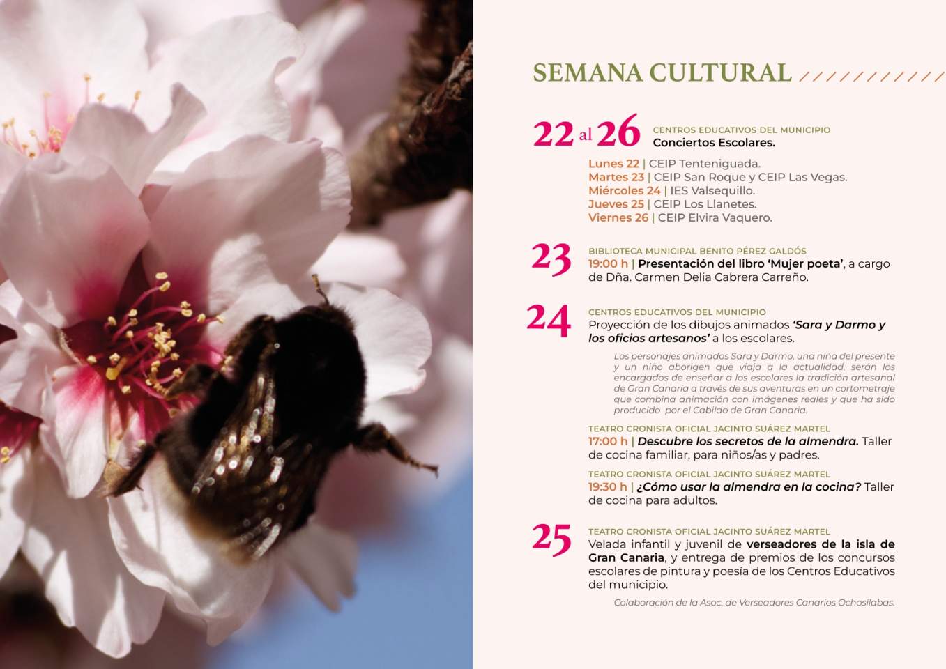 Antes, el consistorio municipal ha organizado una semana cultural en el marco de esta fiesta. A lo largo de esta semana, el municipio acogerá unos conciertos escolares por todos los colegios del municipio y además la presentación del libro Mujer Poeta de Carmen Delia Cabrera. También habrá talleres de cocina familiar y otro solo para adultos. Los más pequeños tendrán una velada para recoger los premios del concurso de poesía y pintura escolar el jueves, 25 de enero. Un acto en el que también participará la Asociación de Verseadores de Canarias 'Ochosílabas'.
