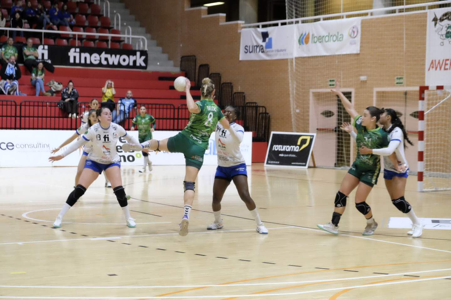 El partido llegaba al ecuador del primer tiempo cuando Larissa anotaba el 4-3 para el Rocasa. Fue la última vez que ambos equipos estuvieron tan cerca en el marcador. El partido comenzó a virarse a favor del Elda Prestigio. Con una Claudia Martínez muy activa en ataque, una defensa aguerrida y una Laura Prades absolutamente impenetrable, el marcador se distanciaba cada vez más.