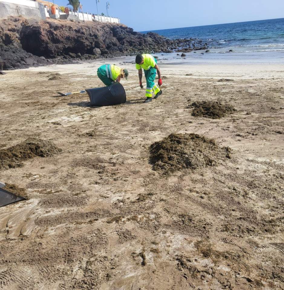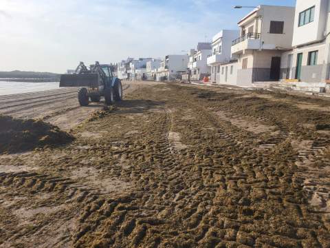 En la última semana, el equipo de Limpieza Viaria y Playas ha desplegado un segundo servicio extraordinario para retirar la acumulación de algas en la arena de la cala de Ojos de Garza.