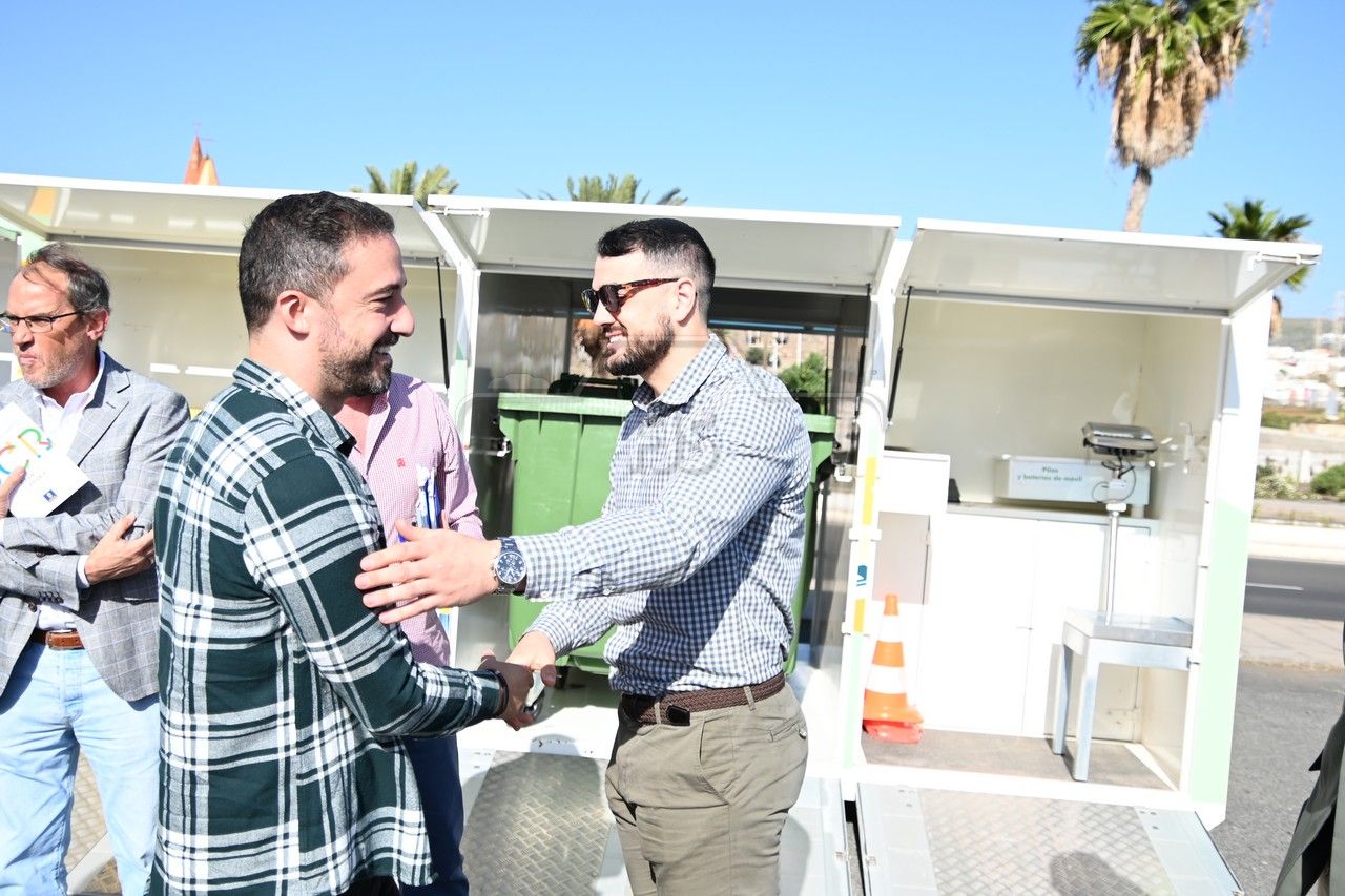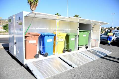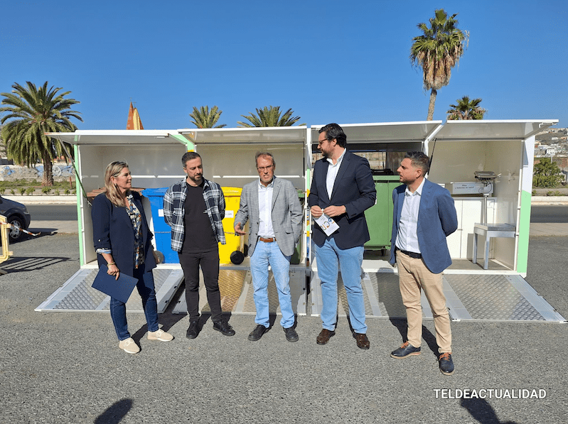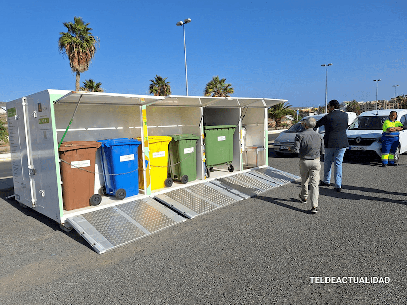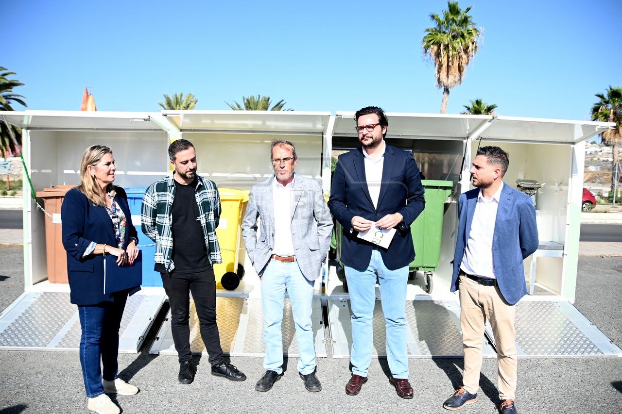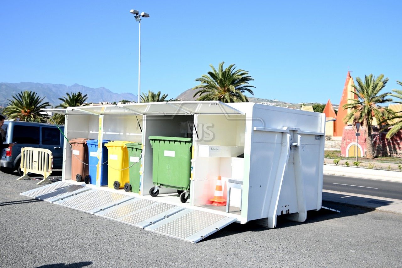 El dispositivo, un contenedor que en su interior dispone de recipientes para las diferentes fracciones de reciclaje, fue presentado este miércoles en un acto al que asistieron el alcalde Juan Antonio Peña, el director insular de Medio Ambiente, Manuel Amador, la concejala de Limpieza Viaria y Recogida de Residuos, María González Calderín, el vicealcalde Sergio Ramos y el concejal de Urbanismo, Juan Francisco Jiménez.