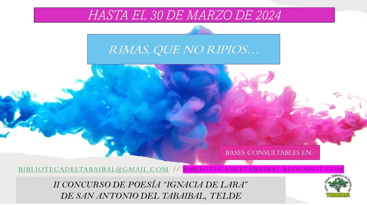 La Biblioteca de la Sociedad Cultural y de Recreo el Tabaibal de San Antonio convoca el segundo Concurso de Poesía Ignacia de Lara, bajo el nombre ‘Rimas, que no ripios…’ El plazo de admisión de los originales, que tendrá tema libre, estará abierto hasta el 30 de marzo.