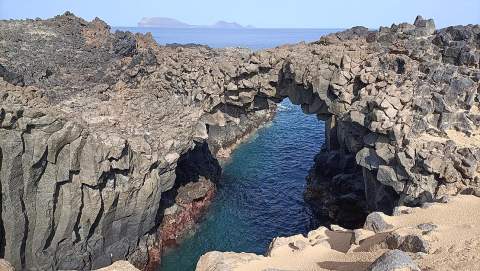 Discurro ahora sobre la arena, siguiendo la serie de los cuatro arcos naturales, alguno tan en precario equilibrio que amenaza desplomarse en cualquier momento y, caminando sobre la desnuda roca volcánica donde destaca la albura de las arenas que la rodean, me encuentro con otro arco más pequeño. Mientras, el mar azul nos alerta de su presencia, revelándonos que él y sólo él es el artífice, el abnegado labrante de este paraíso geológico.