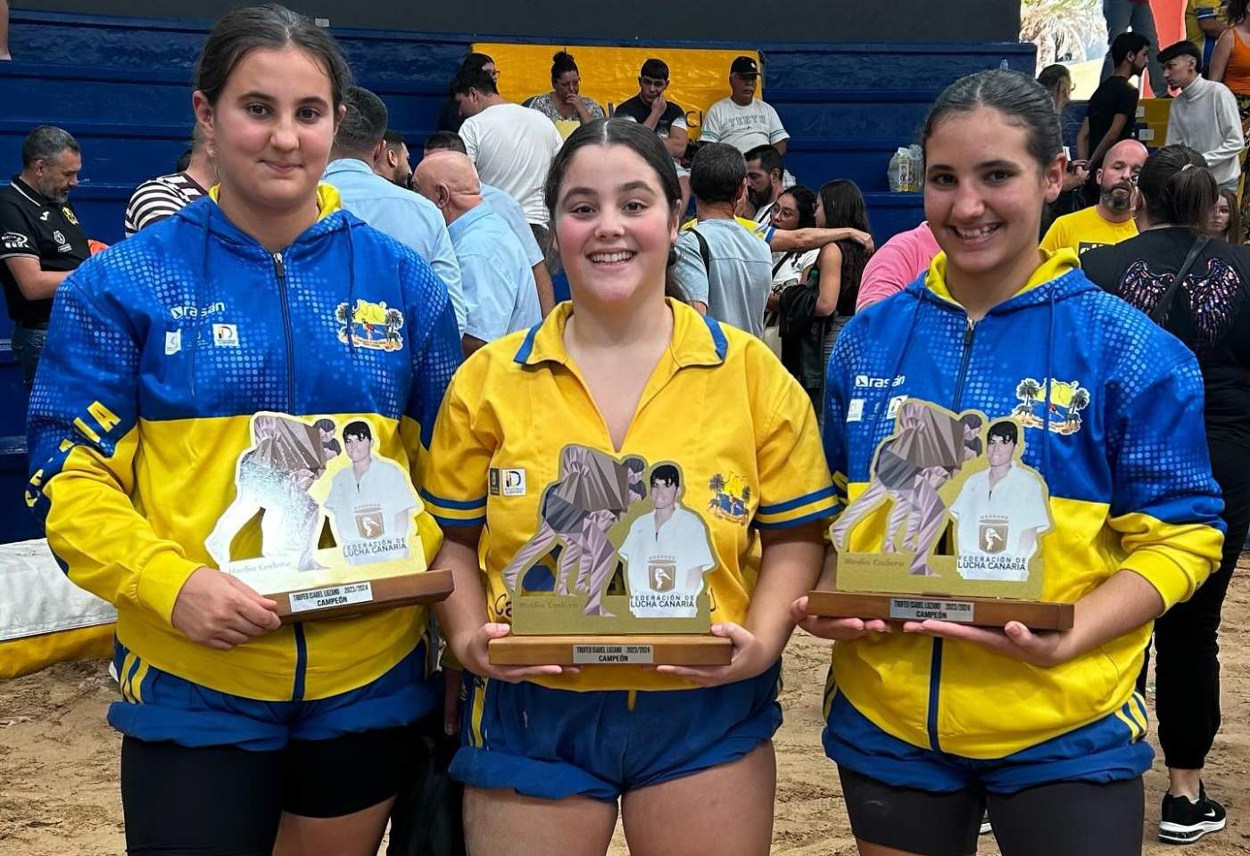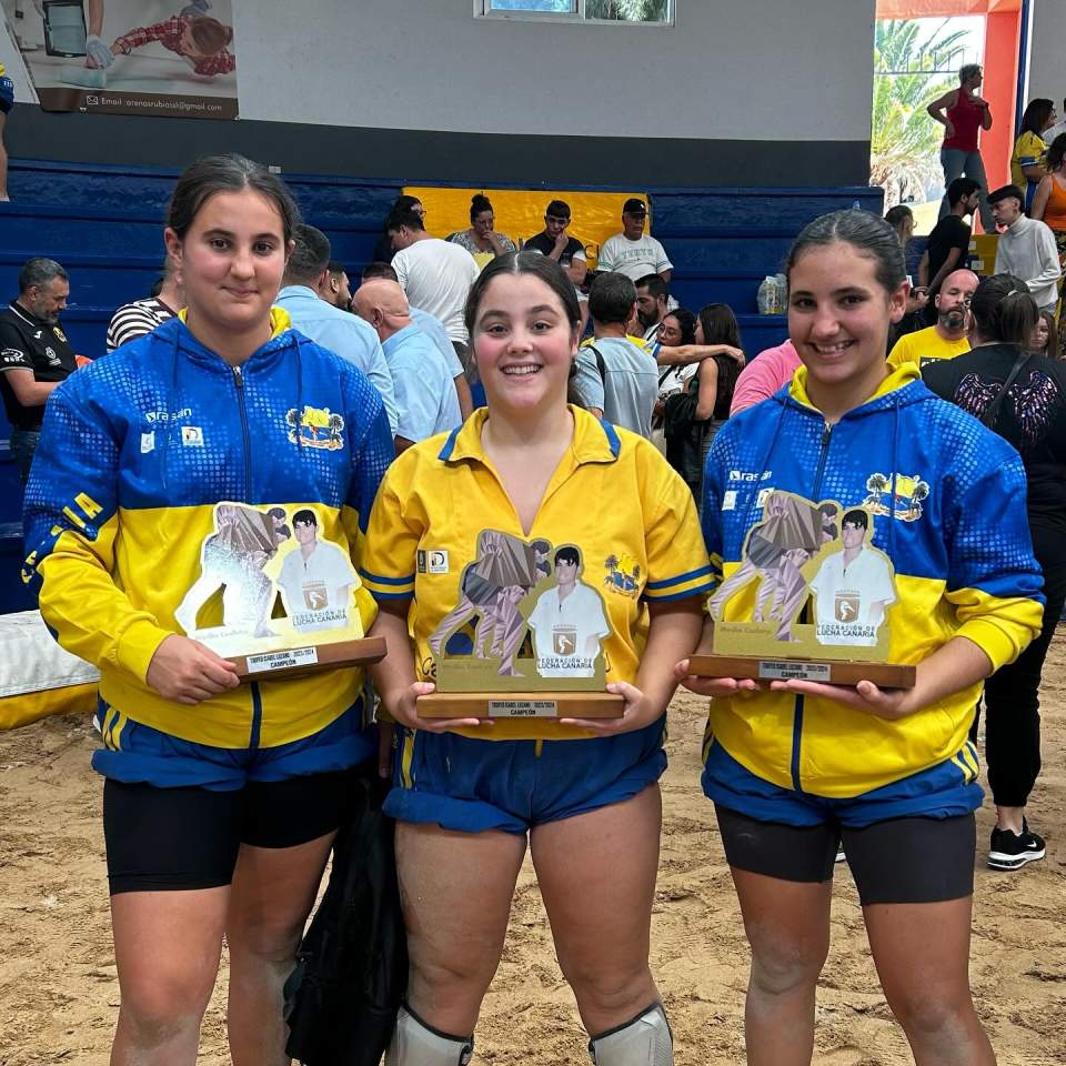 La Concejalía de Actividad Física y Deportes del Ayuntamiento de Telde, que dirige Cristhian Santana, felicita a las luchadoras del Castro Morales Ainhoa Hernández y las hermanas Marta y Elena Casimiro, por proclamarse Campeonas Autonómicas con la selección de Gran Canaria, tras vencer en la final del I Torneo Isabel Lozano Martel a la selección de Tenerife por 13 a 16.