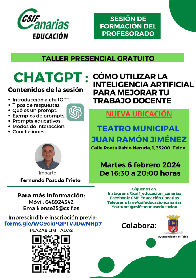 Esta formación estuvo impartida por el docente en activo Fernando Posada Prieto y experto en tecnologías educativas de aplicación en el sector docente. El objetivo era conocer y utilizar las posibilidades que ofrece la Inteligencia Artificial a través de Chat-GPT como chatbot generativo para facilitar la elaboración de recursos y materiales por parte del docente en distintas áreas y niveles.