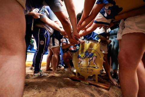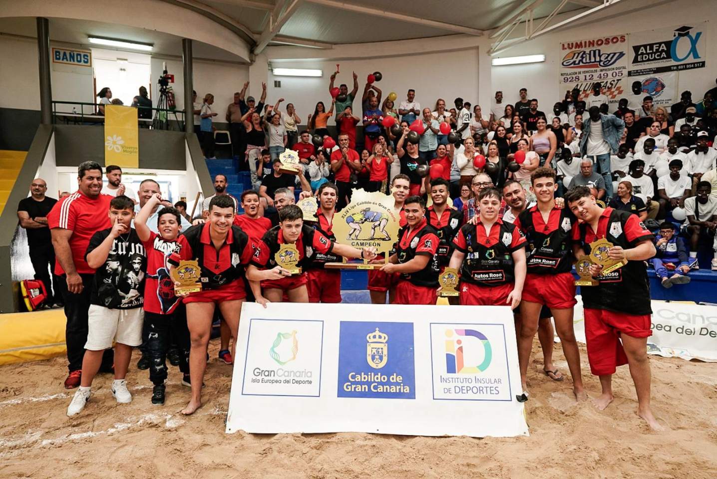 El terrero del Cruce de Arinaga, en Agüimes, volvió a ser este fin de semana epicentro de la Lucha Canaria para celebrar las finales de la Liga Cabildo de Gran Canaria de Categorías Base. En la categoría juvenil, el Club de Lucha Castro Morales alcanzó el título tras superar a Los Guanches (12-9), aunque antes, el conjunto teldense logró en la jornada de sábado una valiosa victoria (9-12) ante el Unión Agüimes, en un terrero que mostró un lleno total para vivir este enfrentamiento.