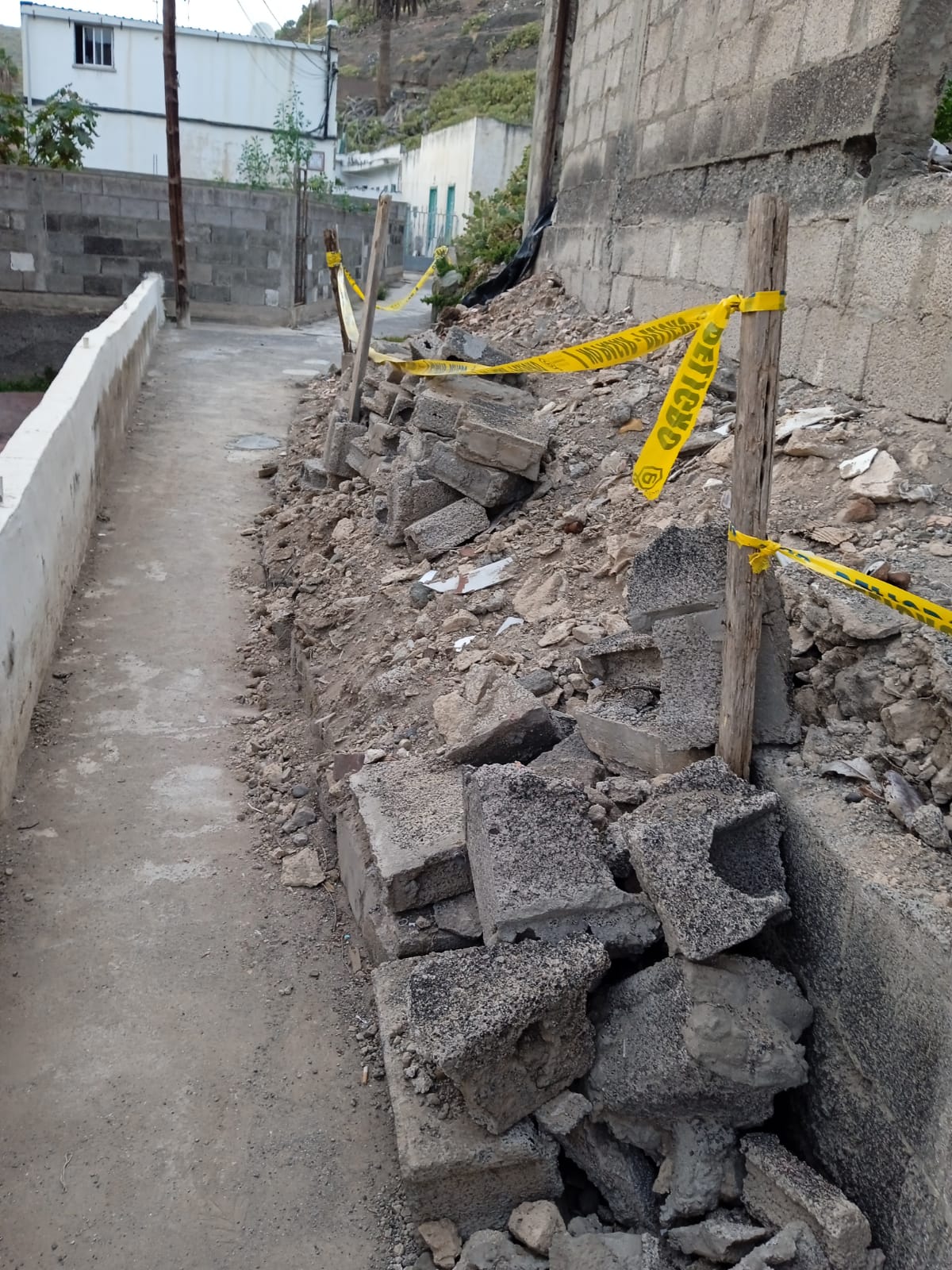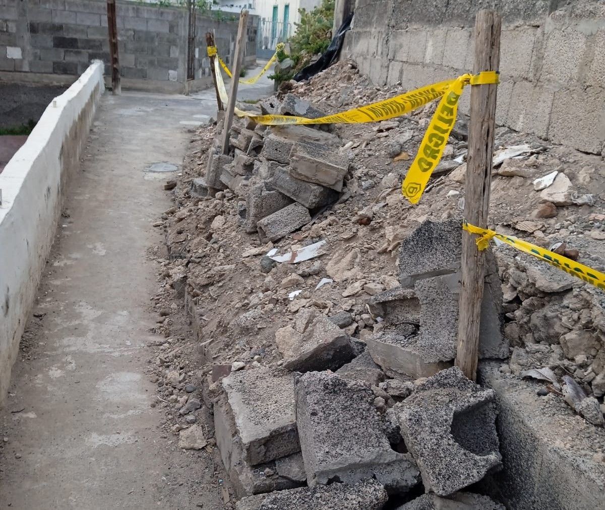 Vecinos de la calle de Blas de Otero, en Jinámar, están dispuestos a recoger firmas para solicitar al Ayuntamiento de Telde la retirada de los escombros de la caída de un muro que obstaculizan el paso por este estrecho camino.