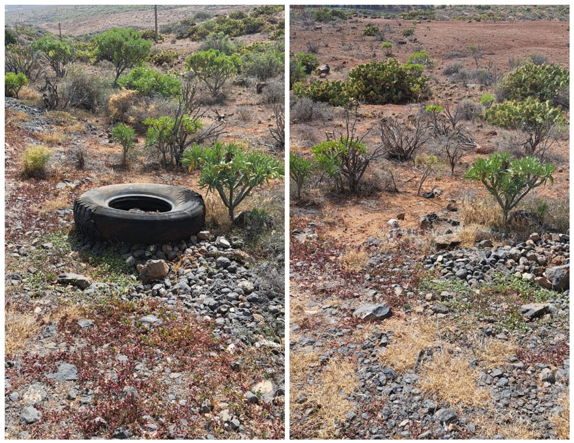 El servicio municipal de Limpieza de Telde llevó a cabo este miércoles la retirada de una rueda de camión abandonada en Lomo La Caldera, dentro del entorno natural de Cuatro Puertas.