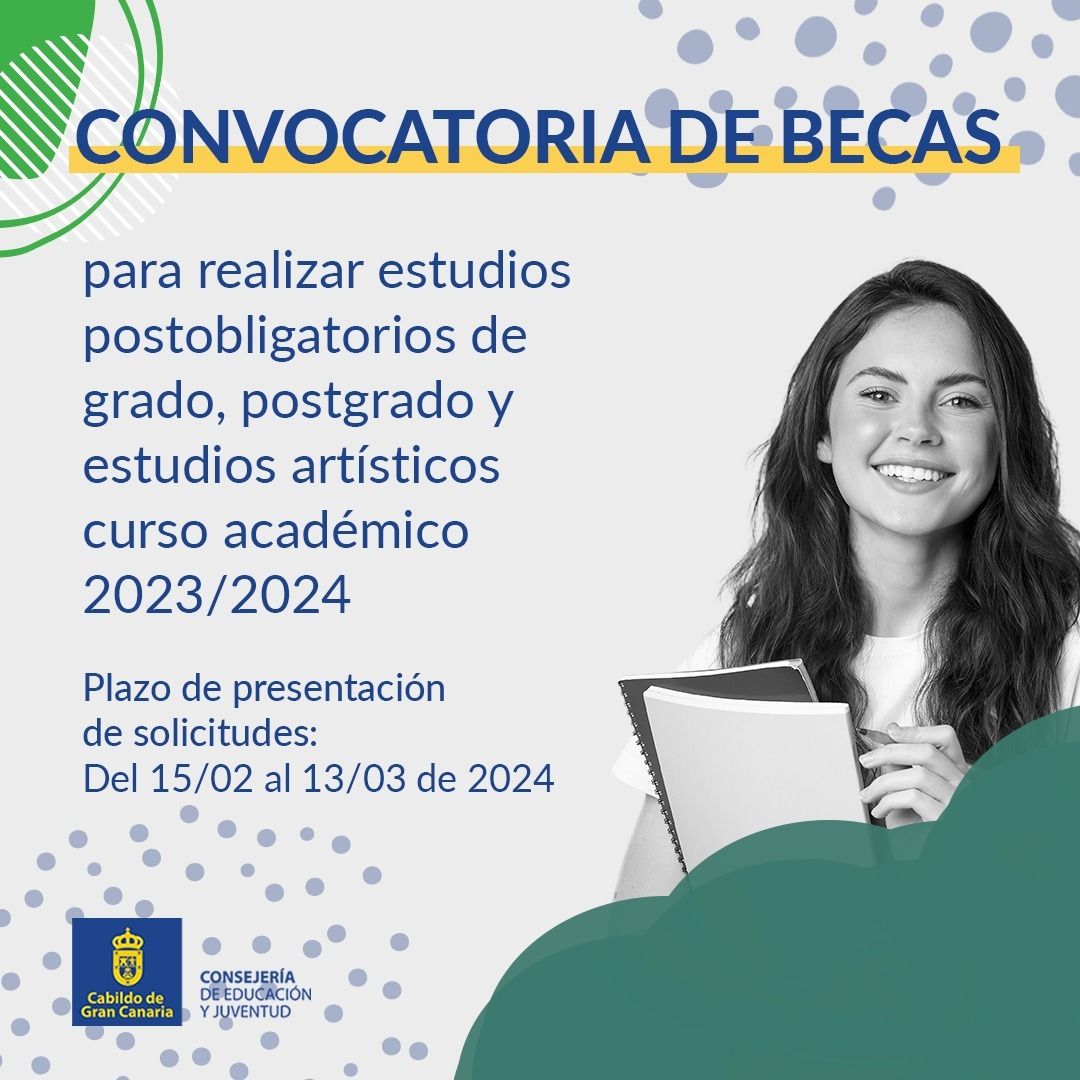 Para más información sobre los requisitos, plazos y lugar de presentación de las solicitudes de beca, la Consejería de Educación y Juventud ha habilitado la siguiente página web: https://grancanariajoven.grancanaria.com/contenido/convocatoria-de-becas-para-realizar-estudios-postobligatorios-de-grado-postgrado-y-estudios-artisticos-2023-2024/3785.