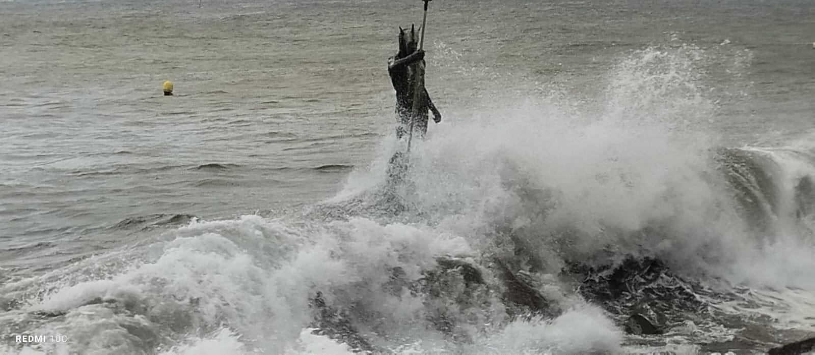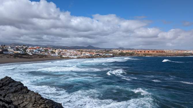 La costa de Telde, en la vertiente oriental de Gran Canaria, se encuentra bajo el influjo de un fuerte oleaje y ráfagas de viento de gran intensidad en estos días, convirtiendo al mar en un espectáculo imponente.