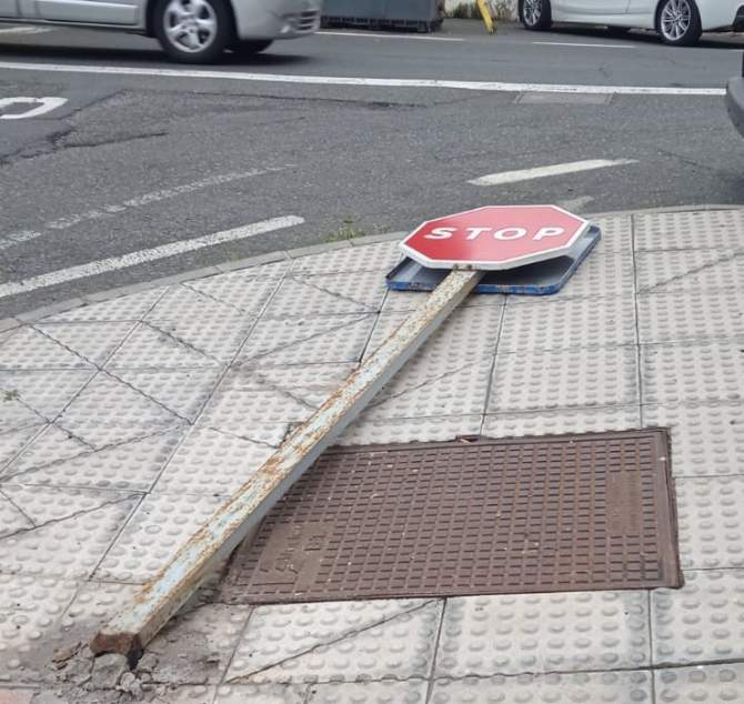 En el transcurso de esta jornada, las intensas ráfagas de viento han provocado la caída de una señal de tráfico de Stop en la salida de la calle Martínez de la Rosa hacia la carretera general (Raimundo Lulio) de La Pardilla, en Telde. La base del poste metálico al que estaba sujeta estaba descompuesta por el óxido.