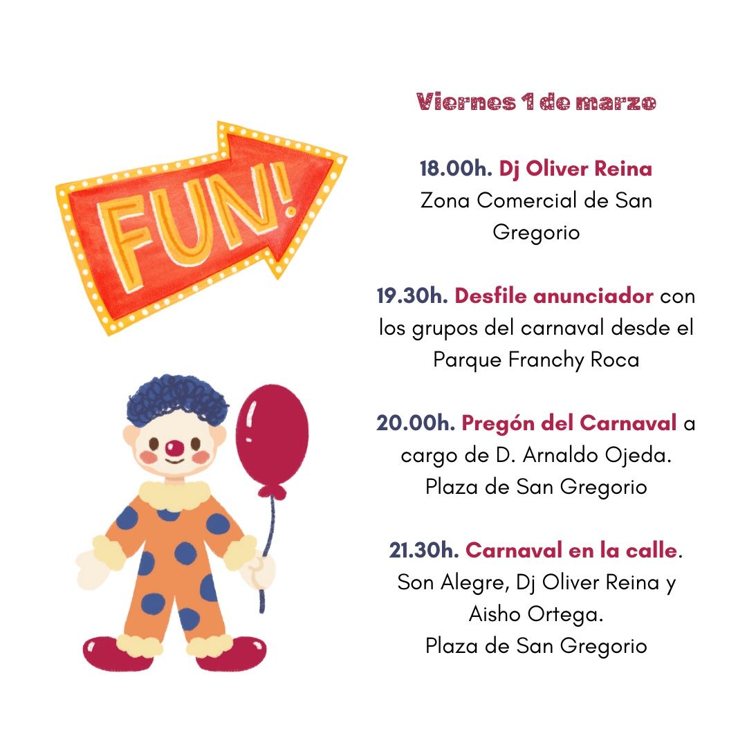 Previamente, desde las 18.00 horas, Dj Oliver inundará de música la zona comercial y a las 19.30 horas será el desfile anunciador con los grupos del carnaval, que iniciarán una ruta desde el parque Franchy Roca.
