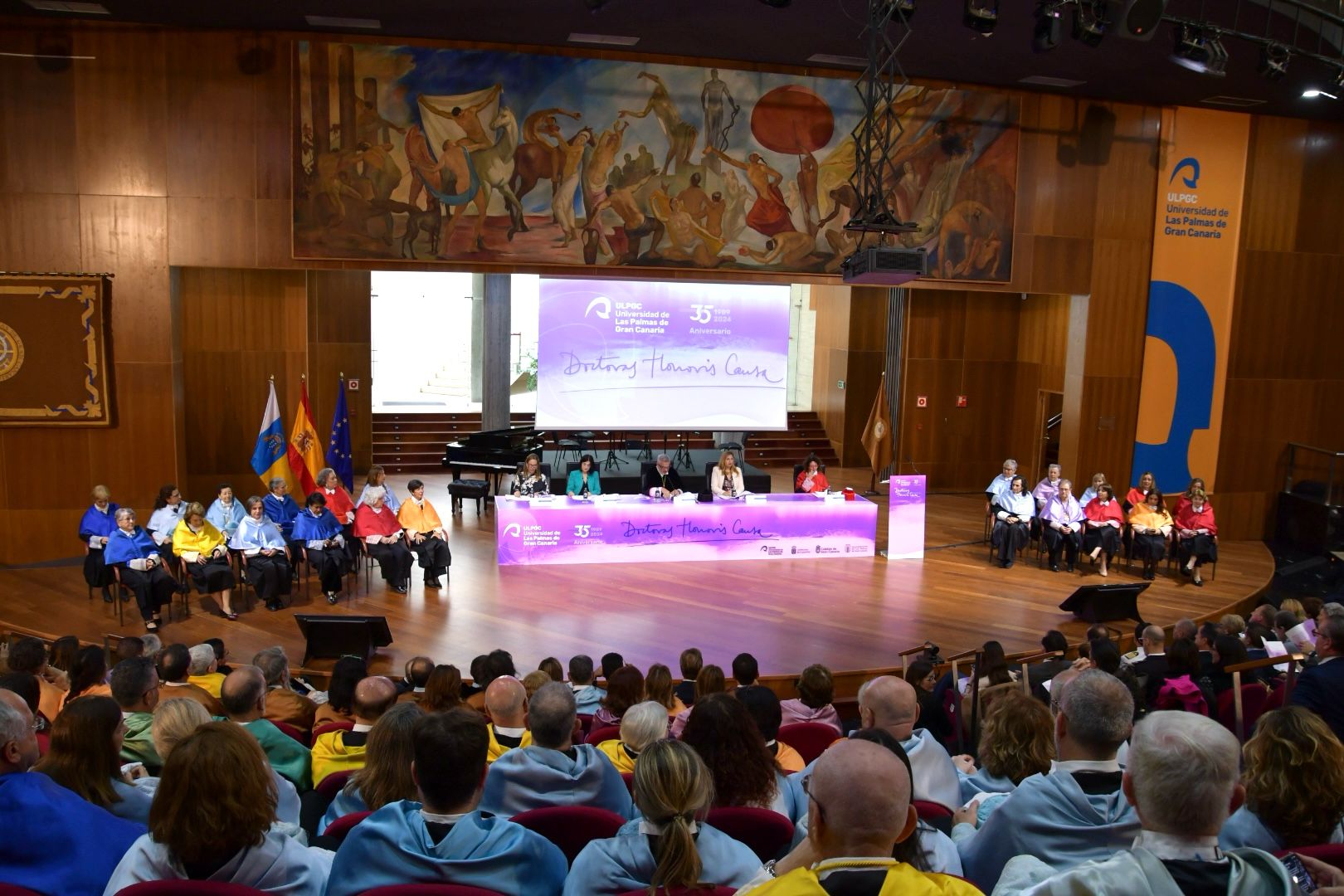 El solemne acto de investidura de las nuevas 11 Doctoras Honoris Causa se enmarca en la celebración del 35º aniversario de la creación de la ULPGC y coincide con los actos conmemorativos con motivo del Día Internacional de Mujer. Para la ULPGC, este acto tiene un significado muy especial, ya que responde a la necesidad de poner en valor los méritos y la excelencia profesional de muchas mujeres y corregir la brecha de género en el cuerpo de Doctores Honoris Causa de la ULPGC, en donde, hasta el momento solo figuraban tres mujeres frente a treinta y siete hombres. “Reconocer y honrar a once mujeres notables que han dedicado sus vidas al avance de los derechos humanos y al empoderamiento de la mujer como motor de la ciencia y la sociedad es algo que no sólo es de justicia, sino que es la expresión del deseo de nuestro Claustro de dar relevancia a estos trabajos”, señaló el rector Lluís Serra.