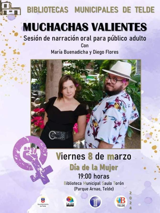 El concejal de Cultura, Juan Martel, anuncia que este viernes 8 de marzo, a las 19:00 horas, la Biblioteca Saulo Torón, ubicada en el parque Arnao, será el escenario de Muchachas Valientes, una sesión de narración oral dirigida a personas adultas. En esta ocasión, las voces de Diego Flores y María Buenadicha transportarán al público a través de una selección de historias provenientes de diferentes partes del mundo.
