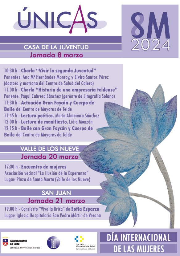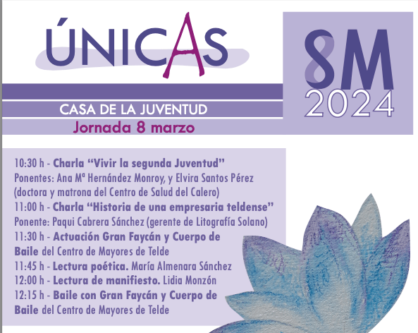 A partir de las 11.30 horas será la actuación Gran Faycán y Cuerpo de Baile del Centro de Mayores de Telde. A las 11.45 horas se celebrará un taller de lectura poética con María Almenara Sánchez y a las 12.00 se realizará la lectura del manifiesto institucional por el Día Internacional de la Mujer, por Lidia Monzón. Para culminar la jornada, a las 12.15 horas el grupo musical y cuerpo de baile Gran Faycan harán las delicias de los asistentes con sus melodías.