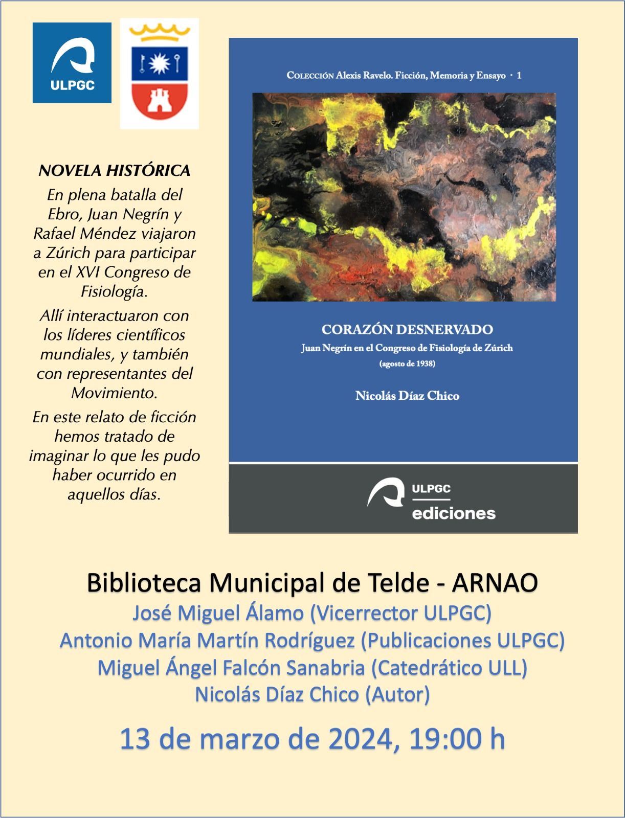 ‘Corazón desnervado’, editado por la ULPGC, relata el viaje en avioneta de Juan Negrín al XVI Congreso de Fisiología de Zúrich, acompado por Rafael Méndez, en agosto de 1938, en plena batalla del Ebro. En este evento interactuaron con los líderes científicos mundiales y también con representantes del Movimiento.