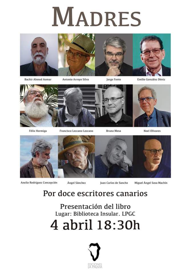 Portada y cartel de la presentación del libro Madres/TA.El escritor afincado en Telde Juan Carlos de Sancho participa como antólogo en el libro Madres, un trabajo que reúne relatos de 12 autores de las Islas y que se presenta el próximo 4 de abril, a las 18.30 horas, en el Biblioteca Insular, en Las Palmas de Gran Canaria.