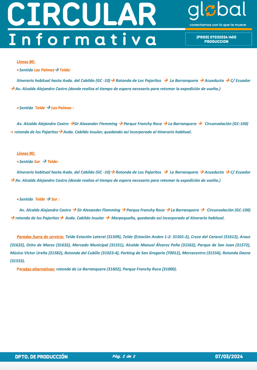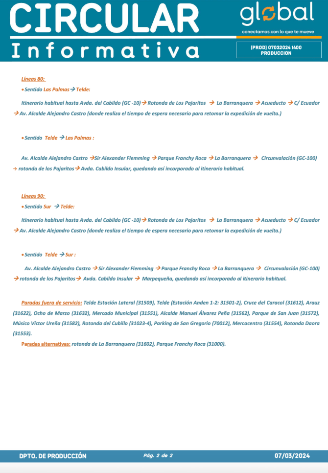 Con motivo de la celebración carnavalera, el servicio de guaguas de Global ha emitido una nota informativa con la modificación de sus recorridos y las líneas y paradas afectadas.
