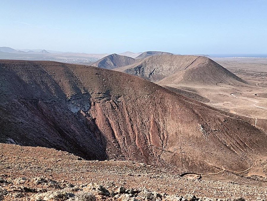 Siguiendo nuestro periplo, encontramos en el Calderón Hondo muy definida la senda que bordea el cráter, una ruta que permite circunvalarlo en su totalidad y regresar de nuevo al mirador habilitado. Existe igualmente otra senda que hace el recorrido del borde del cráter por su cara interior. Ambos senderos revelan el uso continuo de los mismos y el impacto de la masiva afluencia de personas al edificio volcánico. Sé que yo soy en este momento uno más ejerciendo presión sobre el edificio volcánico, pero también sé que no llegué en coche ni ascendí por el “puente de plata” que lleva al mirador. Yo realizo una travesía más dura, menos impactante y para ello me desvío por una senda bien definida que se encuentra habilitada en su cara norte, iniciando así un breve descenso que me conduce a la degollada que permite abordar el último cono antes de culminar esta etapa en el pueblo de Lajares o Los Lajares. Me refiero a la montaña Colorada. Una pista que destaca en la distancia por los materiales que componen su suelo -un profundo color rojizo-, discurre al pie de la montaña, tras terminar el sendero. Supe entonces, por la cartelería asociada a “Caminos naturales de Fuerteventura” y que se encuentra al pie de este cono si accedemos a él partiendo del pueblo de Lajares, de la prohibición de tránsito por la parte alta de esta montaña, al igual que del descenso al interior de su cráter y también de la prohibición de hacer la ruta de este cono y el Calderón Hondo a través de sus cimas. Ante el desconocimiento involuntario, estimo necesario un panel con información semejante cuando se pretenda abordar estos conos, partiendo de Corralejo.