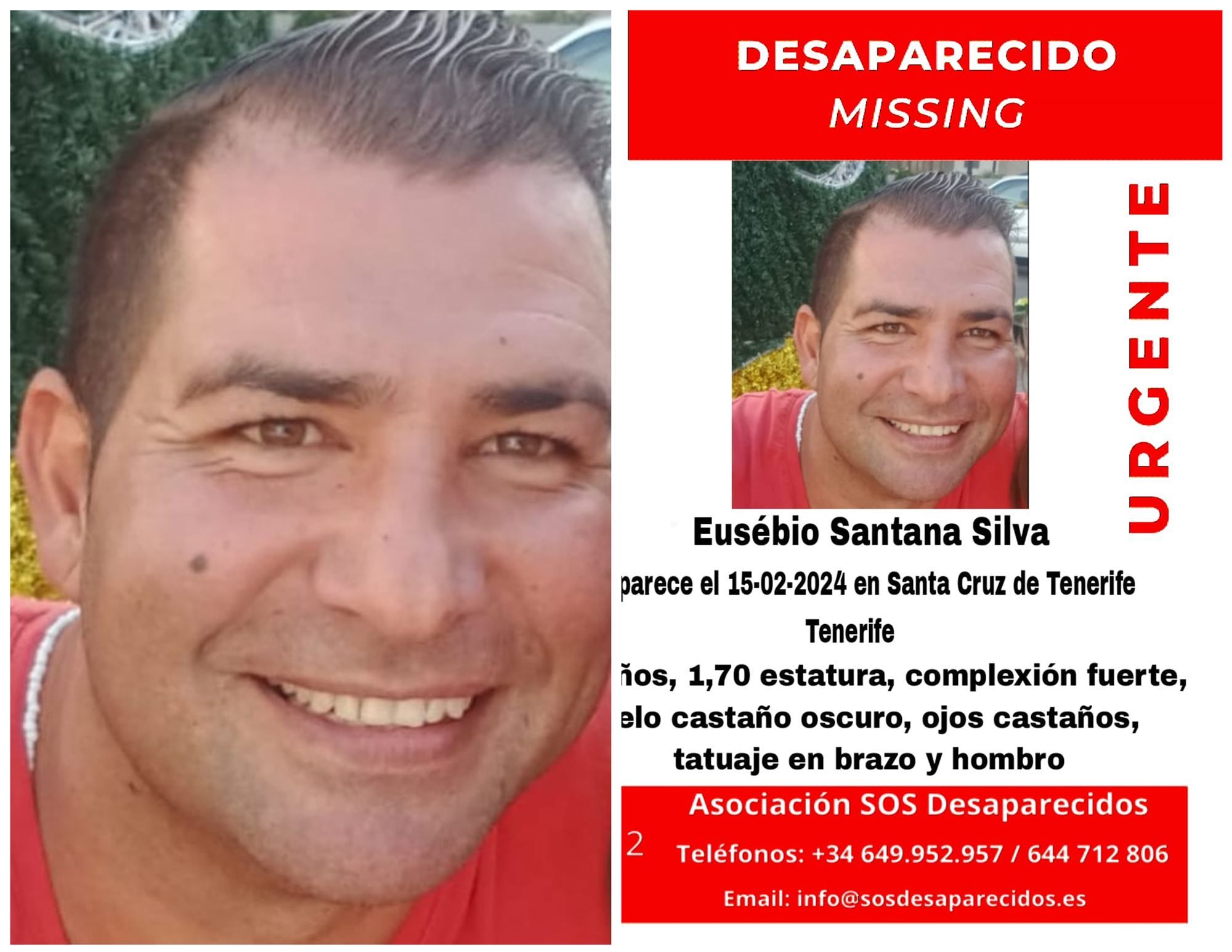 Ante esta preocupante situación, la Asociación SOS Desaparecidos se ha sumado a la búsqueda de Eusebio Santana y pone a disposición de cualquier persona que pueda aportar alguna pista para su localización los teléfonos 649.952.957 y 644.712.806, así como el correo electrónico info@sosdesaparecidos.es.