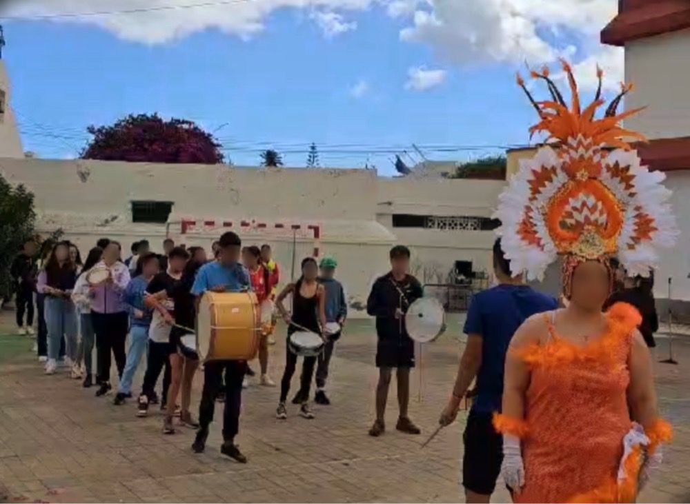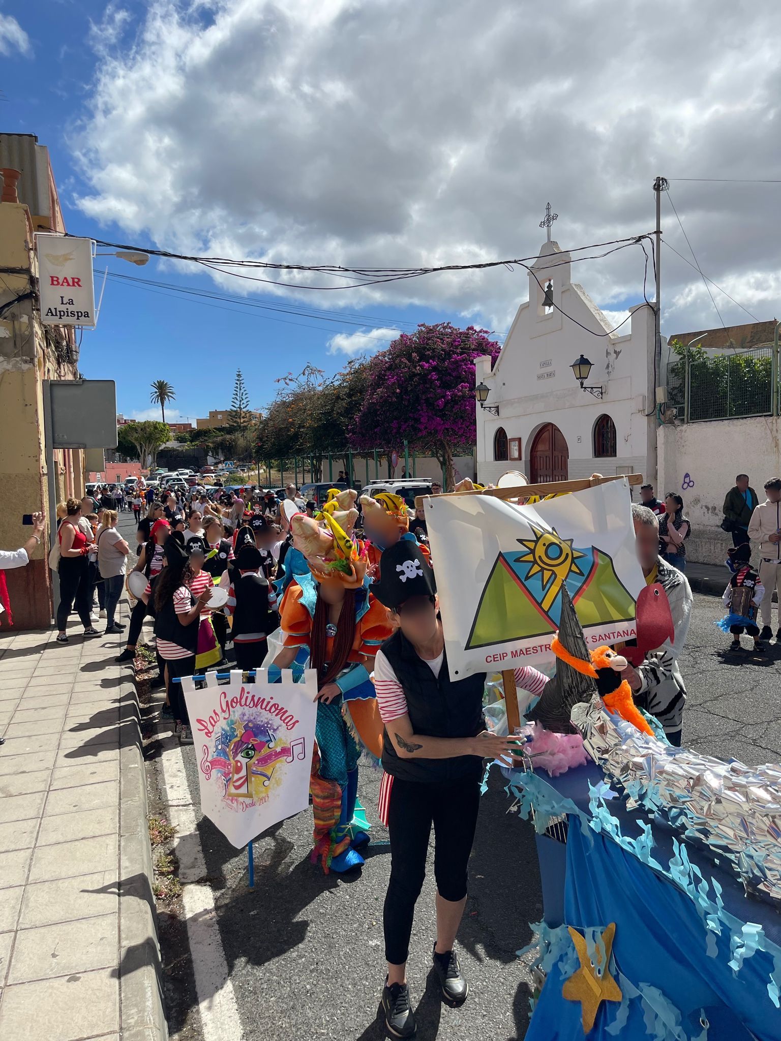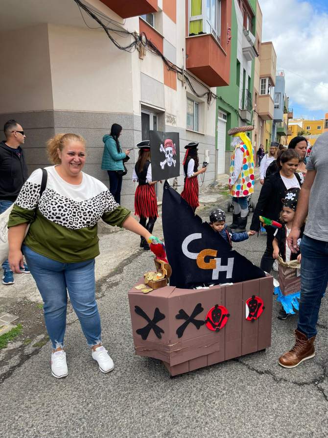 Encabezado por la simpática sardina, junto a la murga Las Golisnionas y al ritmo de la batucada infantil del CEIP Maestro Félix Santana, el desfile recorrió las calles del barrio en un ambiente festivo que llegó a cada rincón. El cierre de la cabalgata estuvo a cargo de la batucada del instituto cabecera del distrito, el IES Valle de los Nueve, que con sus tambores contagiaron el ritmo carnavalero a todos los participantes y vecinos. Junto a la batucada del IES desfiló también una antigua alumna del colegio como representante de la comparsa Chiramay.