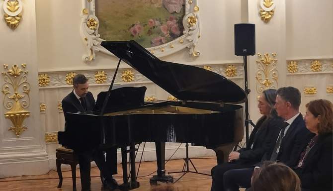 El teldense ofreció al piano composiciones de la pianista y compositora Rosa María Ascot (1902-2002), personalidad estudiada y traída a la luz de la intelectualidad del siglo XX por Ignacio Clemente Estupiñán, quien en este reconocimiento estuvo arropado por numeroso público, autoridades, familiares, amigos que llenaba la sala del Gabinete Literario.