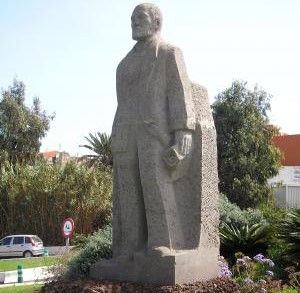 Se trata de una escultura de bulto redondo o exenta de dos metros y medio de alto, cuyo material de ejecución es la piedra, concretamente de cantería de Arucas y su técnica de ejecución fue la extractiva(de forma directa). Es una obra figurativa, en la cual a manera casi de altísimo relieve, si no fuese por el busto que sobresale. El personaje se representa con una postura frontal y algo rígida, con los brazos caídos verticalmente y portando en una de sus manos unos papeles enrollados. Las piernas tienen un tratamiento muy geométrico y vertical sin ningún tipo de movilidad, salvo el desnivel donde se apoya justo la pierna que coincide con la mano que porta los referidos papeles. El personaje viste camisa de cuello alto con pajarita, chaleco y chaqueta. La visión (casi de ley de la frontalidad) algo hierática, salvo en algunas licencias, me traen a la mente la escultura egipcia. Sin embargo, la cabeza, en contraste con el resto del cuerpo, presenta un mayor naturalismo y realismo. Su autor es Juan Borges Linares.
